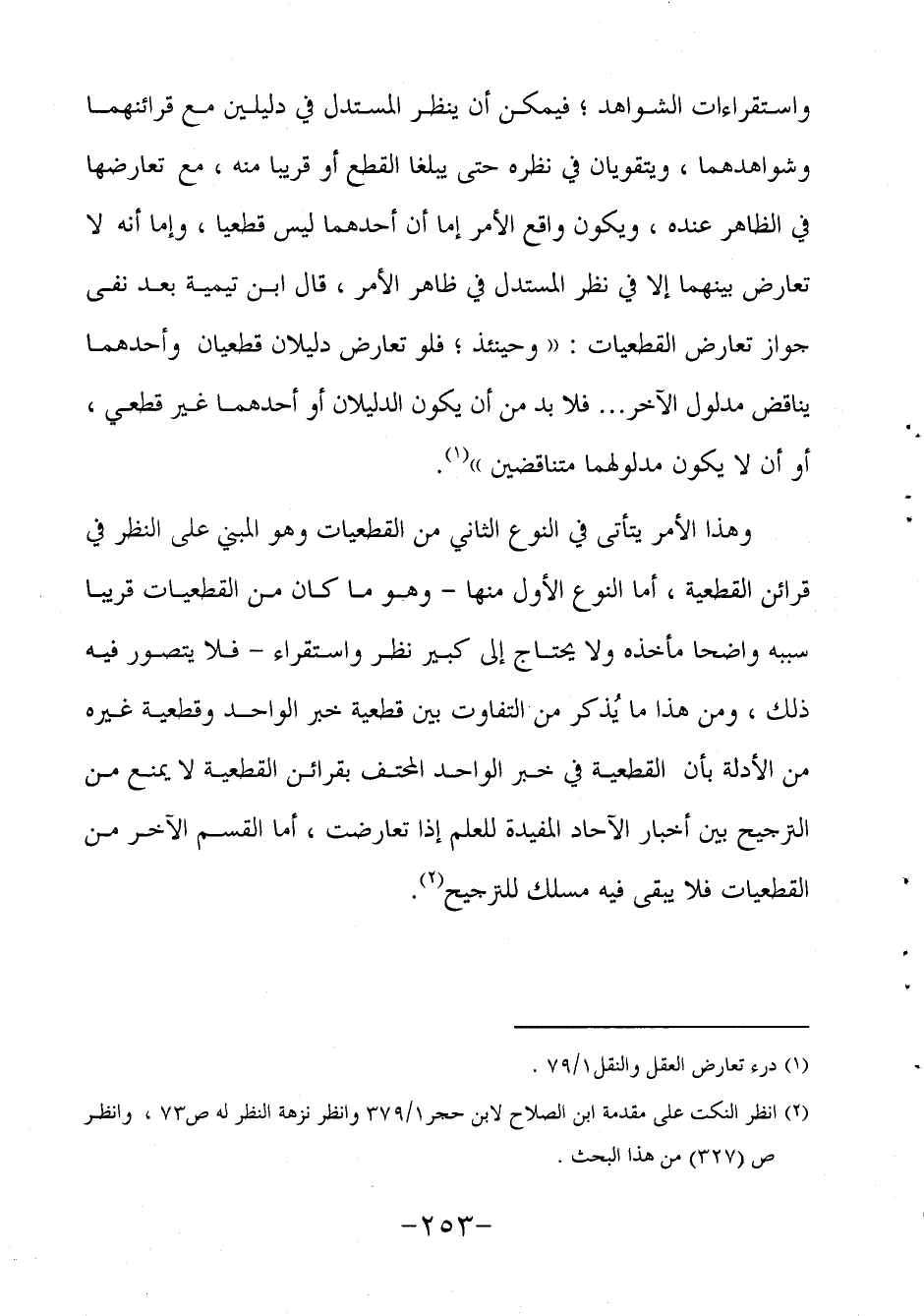 وهذا الأمر يتأتى في النوع الثاني من القطعيات وهو المبني على النظر في قرائن القطعية، أما النوع الأول منها - وهو ما كان من القطعيات قريبا سببه واضحا مأخذه ولا يحتاج إلى كبير نظر واستقراء - فلا يتصور فيه ذلك، ومن هذا ما يُذكر من التفاوت بين قطعية خبر الواحد وقطعية غيره من الأدلة بأن القطعية في خبر الواحد المحتف بقرائن القطعية لا يمنع من الترجيح بين أخبار الآحاد المفيدة للعلم إذا تعارضت، أما القسم الآخر من القطعيات فلا يبقى فيه مسلك للترجيح2.
