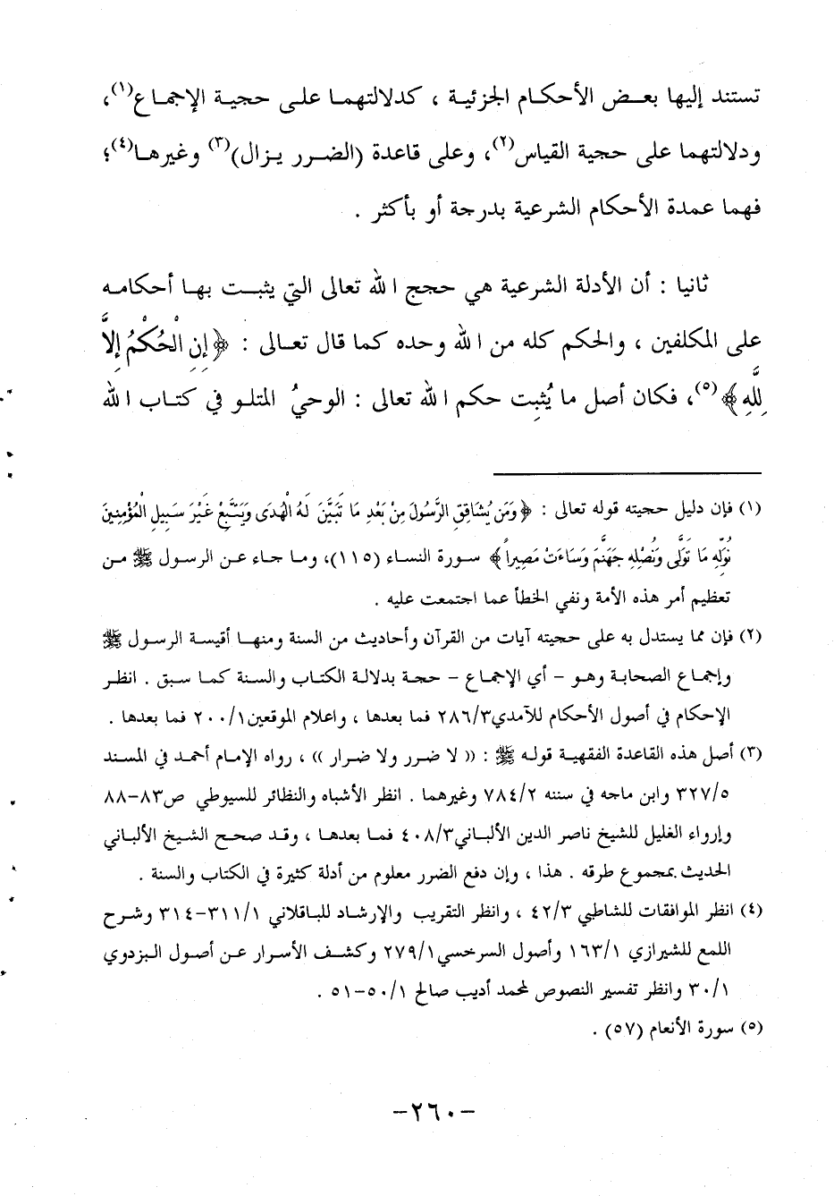 ثانيا: أن الأدلة الشرعية هي حجج الله تعالى التي يثبت بها أحكامه على المكلفين، والحكم كله من الله وحده كما قال تعالى: {إِنِ الْحُكْمُ إِلاَّ لِلَّهِ} 5، فكان أصل ما يُثبِت حكم الله تعالى الوحي المتلو في كتاب الله