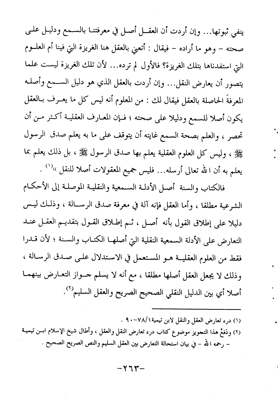 2 ودَفعُ هذا التجويز موضوع كتاب درء تعارض النقل والعقل، وأطال شيخ الإسلام ابن تيمية - رحمه الله - في بيان استحالة التعارض بين العقل السليم والنص الصريح الصحيح.