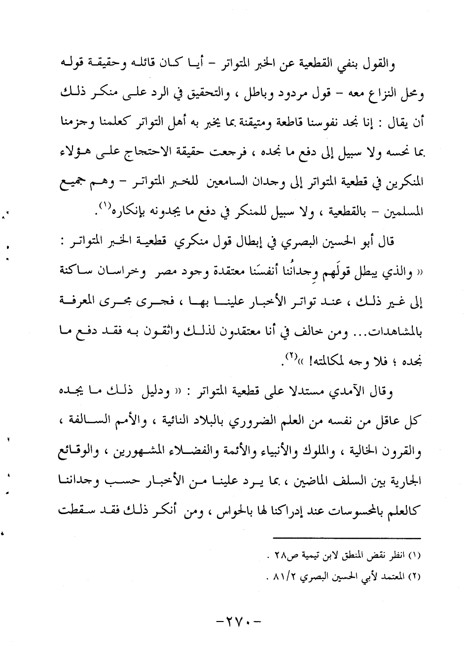 قال أبو الحسين البصري في إبطال قول منكري قطعية الخبر المتواتر: "والذي يبطل قولَهم وِجدانُنا أنفسَنا معتقدة وجود مصر وخراسان ساكنة إلى غير ذلك، عند تواتر الأخبار علينا بها، فجرى مجرى المعرفة بالمشاهدات ... ومن خالف في أنا معتقدون لذلك واثقون به فقد دفع ما نجده فلا وجه لمكالمته"2.