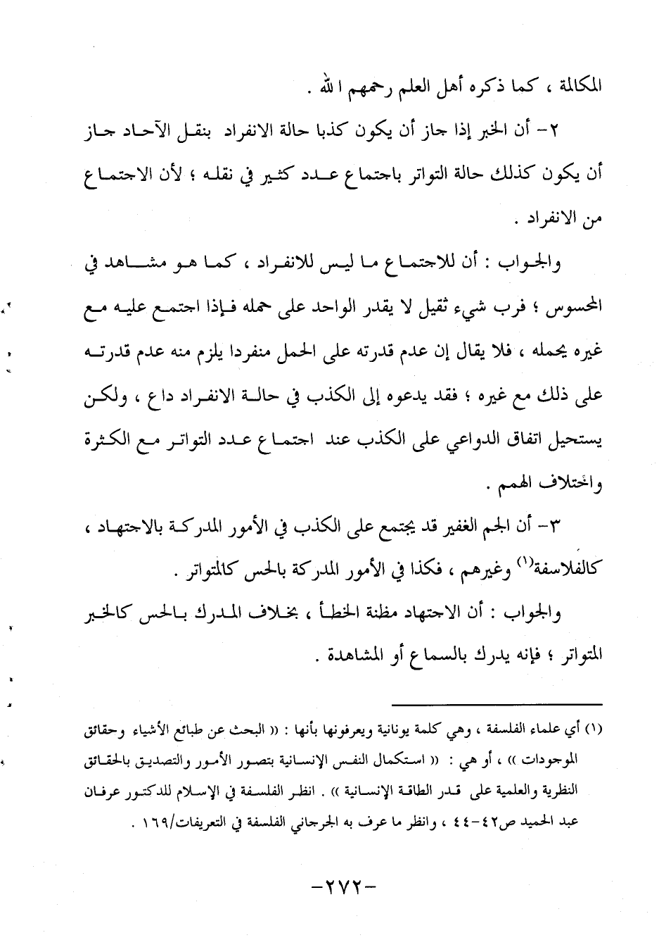 3- أن الجم الغفير قد يجتمع على الكذب في الأمور المدركة بالاجتهاد كالفلاسفة1 وغيرهم، فكذا في الأمور المدركة بالحس كالمتواتر.