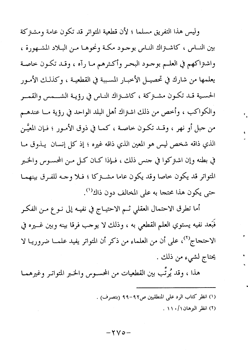 وليس هذا التفريق مسلما، لأن قطعية المتواتر قد تكون عامة ومشتركة بين الناس كاشتراك الناس بوجود مكة ونحوها من البلاد المشهورة واشتراكهم في العلم بوجود البحر وأكثرهم ما رآه، وقد تكون خاصة يعلمها من شارك في تحصيل الأخبار المسببة في القطعية، وكذلك الأمور الحسية قد تكون مشتركة كاشتراك الناس في رؤية الشمس والقمر والكواكب، وأخص من ذلك اشتراك أهل البلد الواحد في رؤية ما عندهم من جبل أو نهر، وقد تكون خاصة كما في ذوق الأمور، فإن المعيَّن الذي ذاقه شخص ليس هو المعين الذي ذاقه غيره، إذ كل إنسان يذوق ما في بطنه وإن اشتركوا في جنس ذلك، فإذا كان كل من المحسوس والخبر المتواتر قد يكون خاصا وقد يكون عاما مشتركا فلا وجه للفرق بينهما حتى يكون هذا محتجا به على المخالف دون ذاك1.