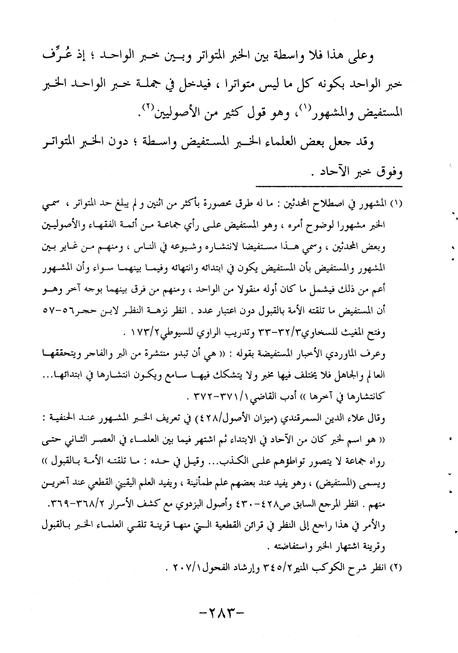 1 المشهور في اصطلاح المحدثين: ما له طرق محصورة بأكثر من اثنين ولم يبلغ حد المتواتر، سمي الخبر مشهورا لوضوح أمره، وهو المستفيض على رأي جماعة من أئمة الفقهاء والأصوليين وبعض المحدثين، وسمي هذا مستفيضا لانتشاره وشيوعه في الناس، ومنهم من غاير بين المشهور والمستفيض بأن المستفيض يكون في ابتدائه وانتهائه وفيما بينهما سواء وأن المشهور أعم من ذلك فيشمل ما كان أوله منقولا من الواحد، ومنهم من فرق بينهما بوجه آخر وهو أن المستفيض ما تلقته الأمة بالقبول دون اعتبار عدد. انظر نزهة النظر لابن حجر56-57 وفتح المغيث للسخاوي3/32-33 وتدريب الراوي للسيوطي2/173.