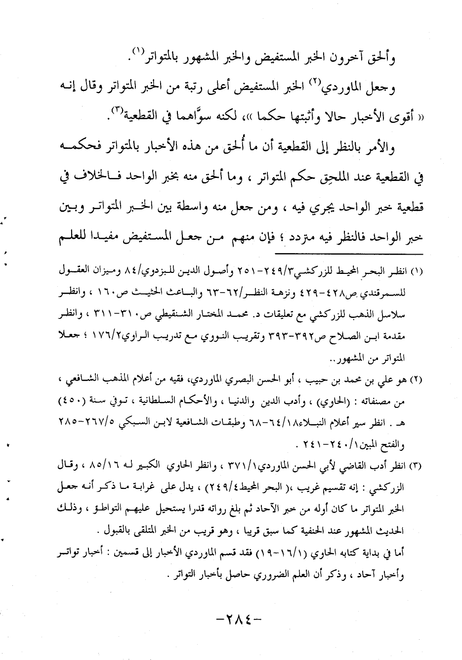 3 انظر أدب القاضي لأبي الحسن الماوردي1/371، وانظر الحاوي الكبير له 16/85، وقال الزركشي: إنه تقسيم غريب، (البحر المحيط4/249) ، يدل على غرابة ما ذكر أنه جعل الخبر المتواتر ما كان أوله من خبر الآحاد ثم بلغ رواته قدرا يستحيل عليهم التواطؤ، وذلك الحديث المشهور عند الحنفية كما سبق قريبا، وهو قريب من الخبر المتلقى بالقبول.