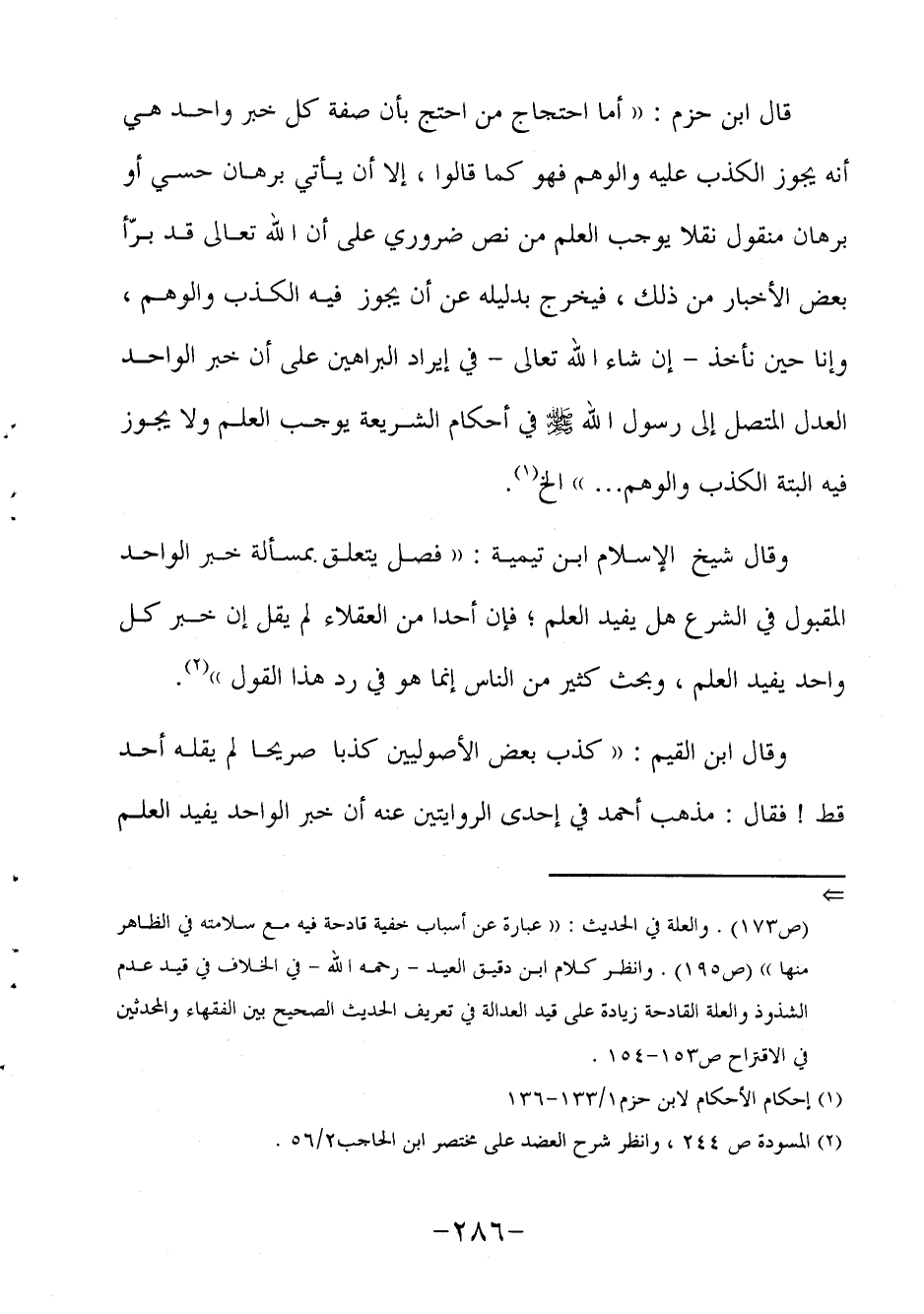 وقال شيخ الإسلام ابن تيمية: "فصل، يتعلق بمسألة خبر الواحد المقبول في الشرع هل يفيد العلم، فإن أحدا من العقلاء لم يقل إن خبر كل واحد يفيد العلم، وبحث كثير من الناس إنما هو في رد هذا القول"2.