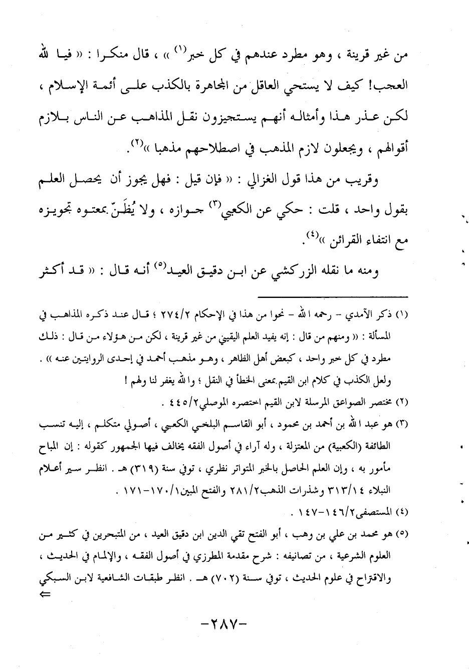 وقريب من هذا قول الغزالي: "فإن قيل: فهل يجوز أن يحصل العلم بقول واحد، قلت: حكي عن الكعبي3 جوازه، ولا يُظَنّ بمعتوه تجويزه مع انتفاء القرائن"4.