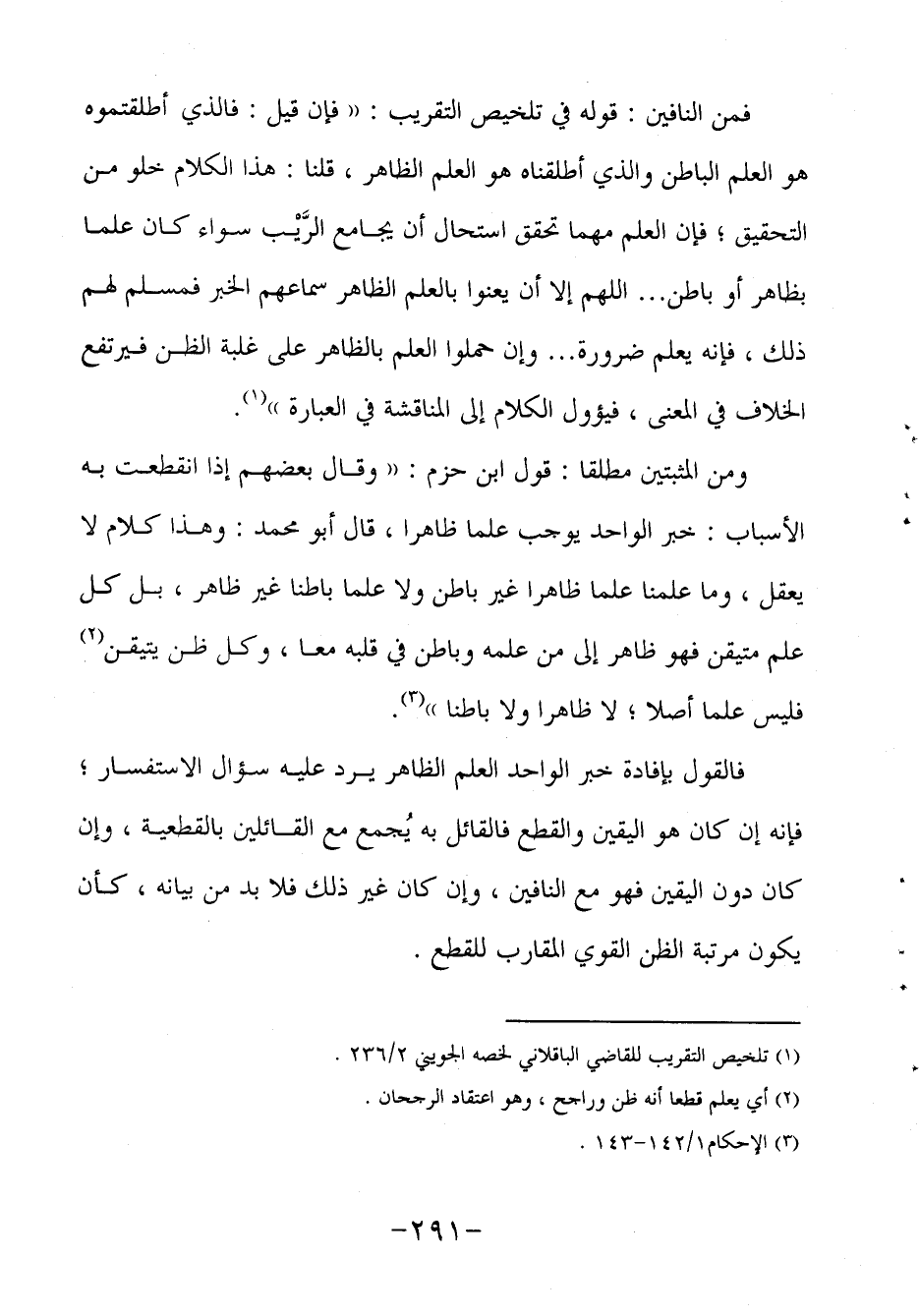فمن النافين: قوله في تلخيص التقريب: "فإن قيل: فالذي أطلقتموه هو العلم الباطن والذي أطلقناه هو العلم الظاهر، قلنا: هذا الكلام خلو من التحقيق فإن العلم مهما تحقق استحال أن يجامع الرَّيْب سواء كان علما بظاهر أو باطن ... اللهم إلا أن يعنوا بالعلم الظاهر سماعهم الخبر فمسلم لهم ذلك، فإنه يعلم ضرورة ... وإن حملوا العلم بالظاهر على غلبة الظن فيرتفع الخلاف في المعنى فيؤول الكلام إلى المناقشة في العبارة"1.