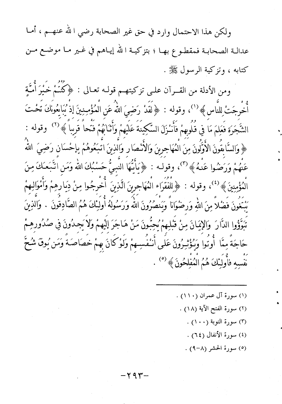 ومن الأدلة من القرآن على تزكيتهم قوله تعالى: {كُنْتُمْ خَيْرَ أُمَّةٍ أُخْرِجَتْ لِلنَّاسِ} 1 وقوله: {لَقَدْ رَضِيَ اللهُ عَنِ الْمُؤْمِنِينَ إِذْ يُبَايِعُونَكَ تَحْتَ الشَّجَرَةِ فَعَلِمَ مَا في قُلُوبِهِمْ فَأَنْزَلَ السَّكِينَةَ عَلَيْهِمْ وَأَثَابَهُمْ فَتْحاً قَرِيباً} 2 وقوله: {وَالسَّابِقُونَ الأَوَّلُونَ مِنَ الْمُهَاجِرِينَ وَالأَنْصَارِ وَالَّذِينَ اتَّبَعُوهُمْ بِإِحْسَانٍ رَضِيَ اللهُ عَنْهُمْ وَرَضُوا عَنْهُ} 3 وقوله: {يَأَيُّهَا النَّبِيُّ حَسْبُكَ اللهُ وَمَنِ اتَبَعَكَ مِنَ الْمُؤْمِنِينَ} 4 وقوله: {لِلْفُقَرَاءِ الْمُهَاجِرِينَ الَّذِينَ أُخْرِجُوا مِنْ دِيَارِهِمْ وَأَمْوَالِهِمْ يَبْتَغُونَ فَضْلاً مِنَ اللهِ وَرِضْوَاناً وَيَنْصُرُونَ اللهَ وَرَسُولَهُ أُولَئِكَ هُمُ الصَّادِقُونَ. وَالَّذِينَ تَبَوَّؤُوا الدَّارَ وَالإِيمَانَ مِنْ قَبْلِهِمْ يُحِبُّونَ مَنْ هَاجَرَ إِلَيْهِمْ وَلاَ يَجِدُونَ في صُدُورِهِمْ حَاجَةً مِمَّا أُوتُوا وَيُؤْثِرُونَ عَلَى أَنْفُسِهِمْ وَلَوْ كَانَ بِهِمْ خَصَاصَةً وَمَن يُوقَ شُحَّ نَفْسِهِ فأُولَئِكَ هُمُ الْمُفْلِحُونَ} 5.
