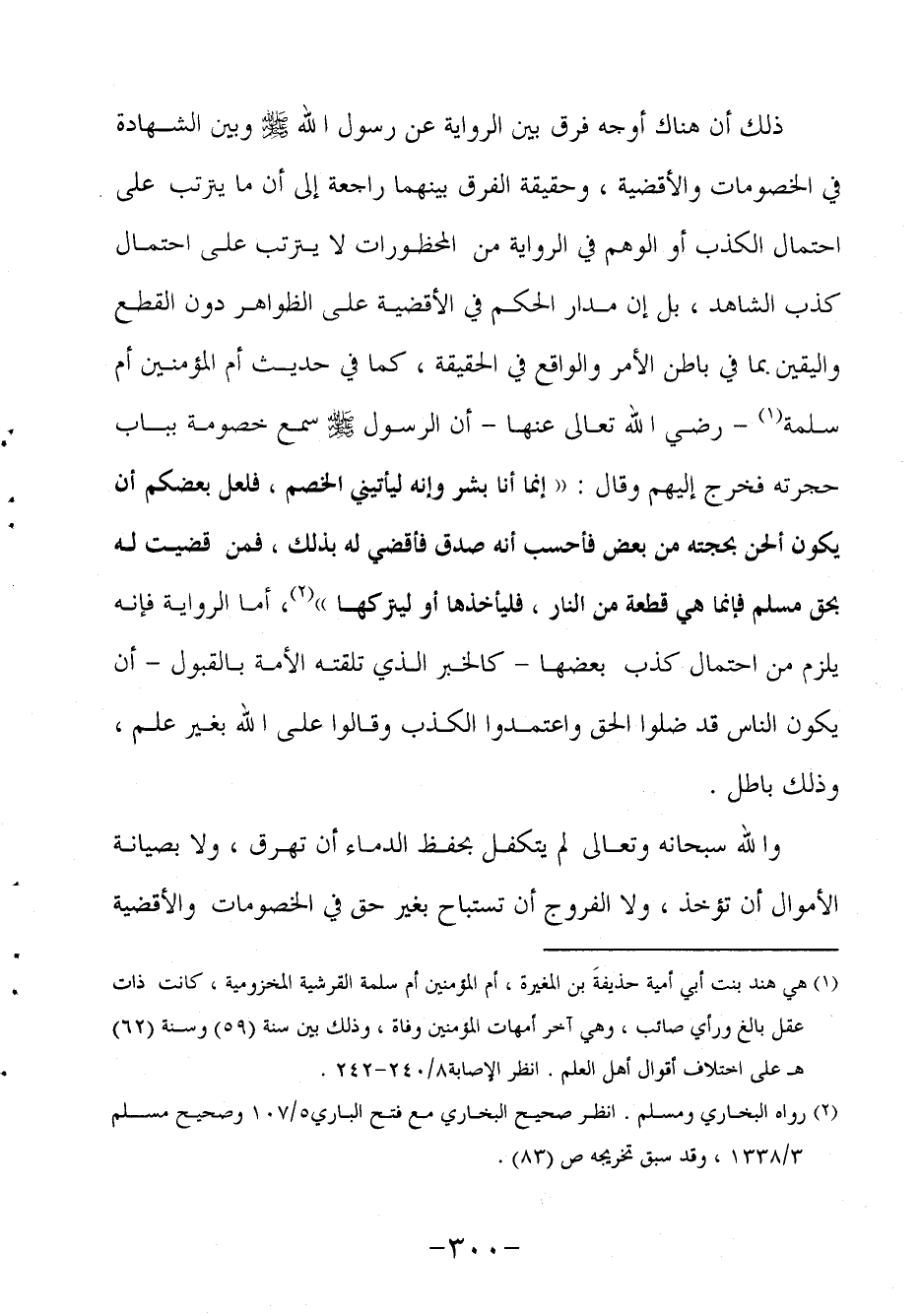 ذلك أن هناك أوجه فرق بين الرواية عن رسول الله صلى الله عليه وسلم وبين الشهادة في الخصومات والأقضية، وحقيقة الفرق بينهما راجعة إلى أن ما يترتب على احتمال الكذب أو الوهم في الرواية من المحظورات لا يترتب على احتمال كذب الشاهد، بل إن مدار الحكم في الأقضية على الظواهر دون القطع واليقين بما في باطن الأمر والواقع في الحقيقة، كما في حديث أم المؤمنين أم سلمة1 - رضي الله تعالى عنها - أن الرسول صلى الله عليه وسلم سمع خصومة بباب حجرته فخرج إليهم وقال: "إنما أنا بشر وإنه ليأتيني الخصم، فلعل بعضكم أن يكون ألحن بحجته من بعض فأحسب أنه صدق فأقضي له بذلك، فمن قضيت له بحق مسلم فإنما هي قطعة من النار، فليأخذها أو ليتركها"2، أما الرواية فإنه يلزم من احتمال كذب بعضها - كالخبر الذي تلقته الأمة بالقبول - أن يكون الناس قد ضلوا الحق واعتمدوا الكذب وقالوا على الله بغير علم، وذلك باطل.