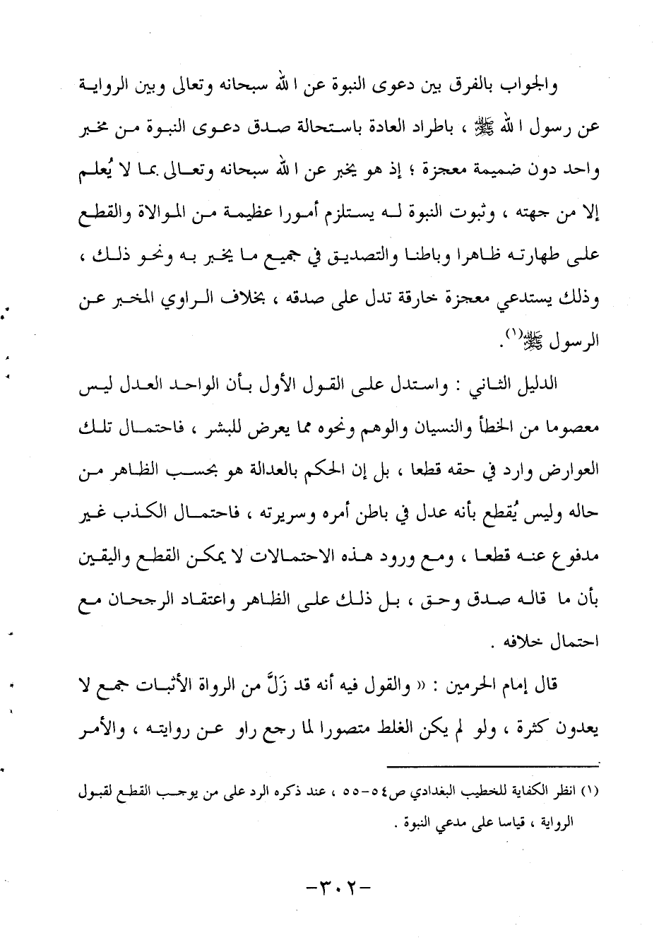 1 انظر الكفاية للخطيب البغدادي ص54-55 عند ذكره الرد على من يوجب القطع لقبول الرواية قياسا على مدعي النبوة.