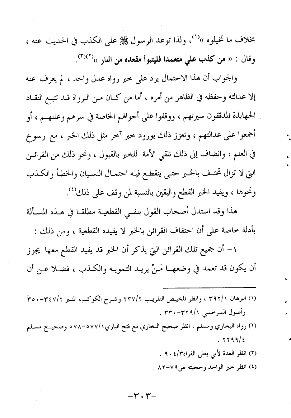 والجواب أن هذا الاحتمال يرد على خبر رواه عدل واحد لم يعرف عنه إلا عدالته وحفظه في الظاهر من أمره، أما من كان من الرواة قد تتبع النقاد الجهابذة المدققون سيرتهم ووقفوا على أحوالهم الخاصة في سرهم وعلنهم أو أجمعوا على عدالتهم وتعزز ذلك بورود خبر آخر مثل ذلك الخبر، مع رسوخ في العلم، وانضاف إلى ذلك تلقي الأمة للخبر بالقبول ونحو ذلك من القرائن التي لا تزال تحتف بالخبر حتى ينقطع فيه احتمال النسيان والخطأ والكذب ونحوها، ويفيد الخبر القطع واليقين بالنسبة لمن وقف على ذلك4.