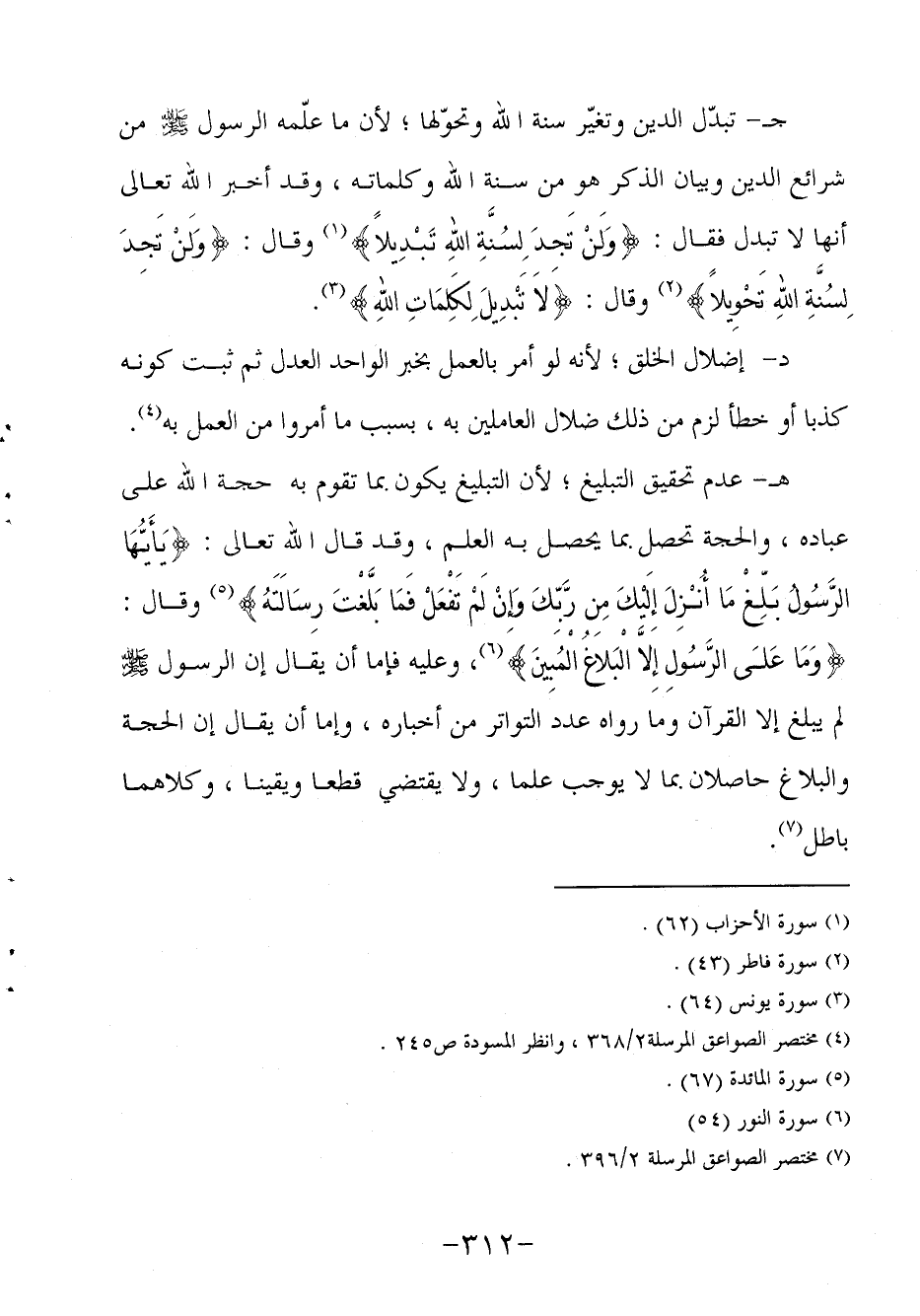 جـ- تبدّل الدين وتغيّر سنة الله وتحوّلها، لأن ما علّمه الرسول صلى الله عليه وسلم من شرائع الدين وبيان الذكر هو من سنة الله وكلماته، وقد أخبر الله تعالى أنها لا تبدل فقال: {وَلَنْ تَجِدَ لِسُنَّةِ اللهِ تَبْدِيلاً} 1 وقال: {وَلَنْ تَجِدَ لِسُنَّةِ اللهِ تَحْوِيلاً} 2 وقال: {لاَ تَبْدِيلَ لِكَلِمَاتِ اللهِ} 3.
