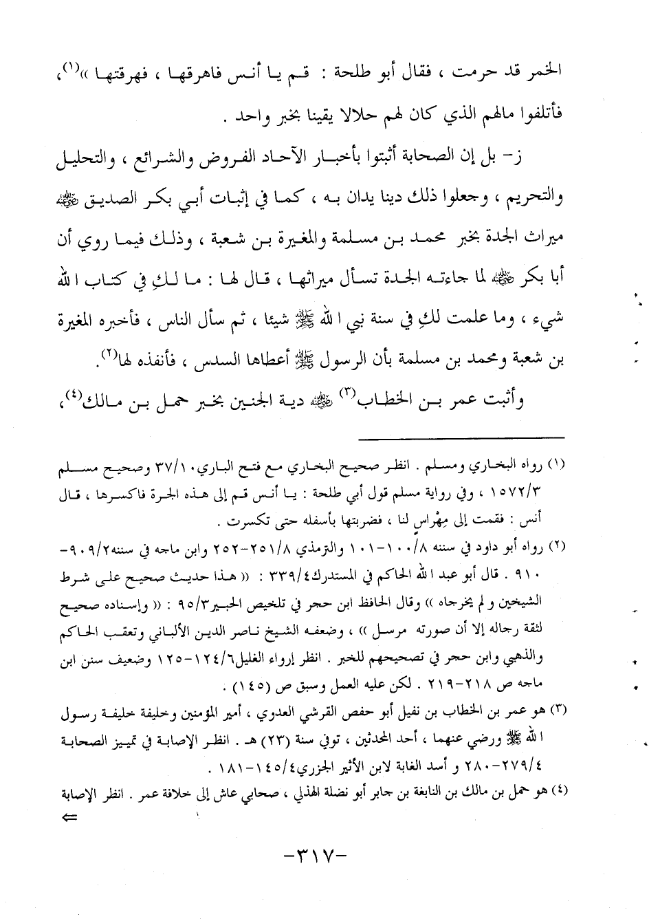 ز- بل إن الصحابة أثبتوا بأخبار الآحاد الفروض والشرائع والتحليل والتحريم وجعلوا ذلك دينا يدان به، كما في إثبات أبي بكر الصديق رضي الله عنه ميراث الجدة بخبر محمد بن مسلمة والمغيرة بن شعبة، وذلك فيما روي أن أبا بكر رضي الله عنه لما جاءته الجدة تسأل ميراثها، قال لها: ما لكِ في كتاب الله شيء وما علمت لكِ في سنة نبي الله صلى الله عليه وسلم شيئا ثم سأل الناس فأخبره المغيرة بن شعبة ومحمد بن مسلمة بأن الرسول صلى الله عليه وسلم أعطاها السدس فأنفذه لها2.