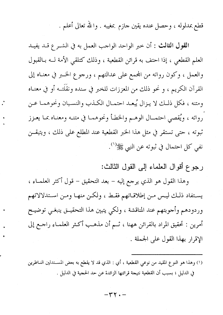 1 وهذا هو النوع المقيد من نوعي القطعية أي الذي قد لا يقطع به بعض المستدلين الناظرين في الدليل بسبب أن القطعية نتيجة قرائنها الزائدة عن حد الحجية في الدليل.