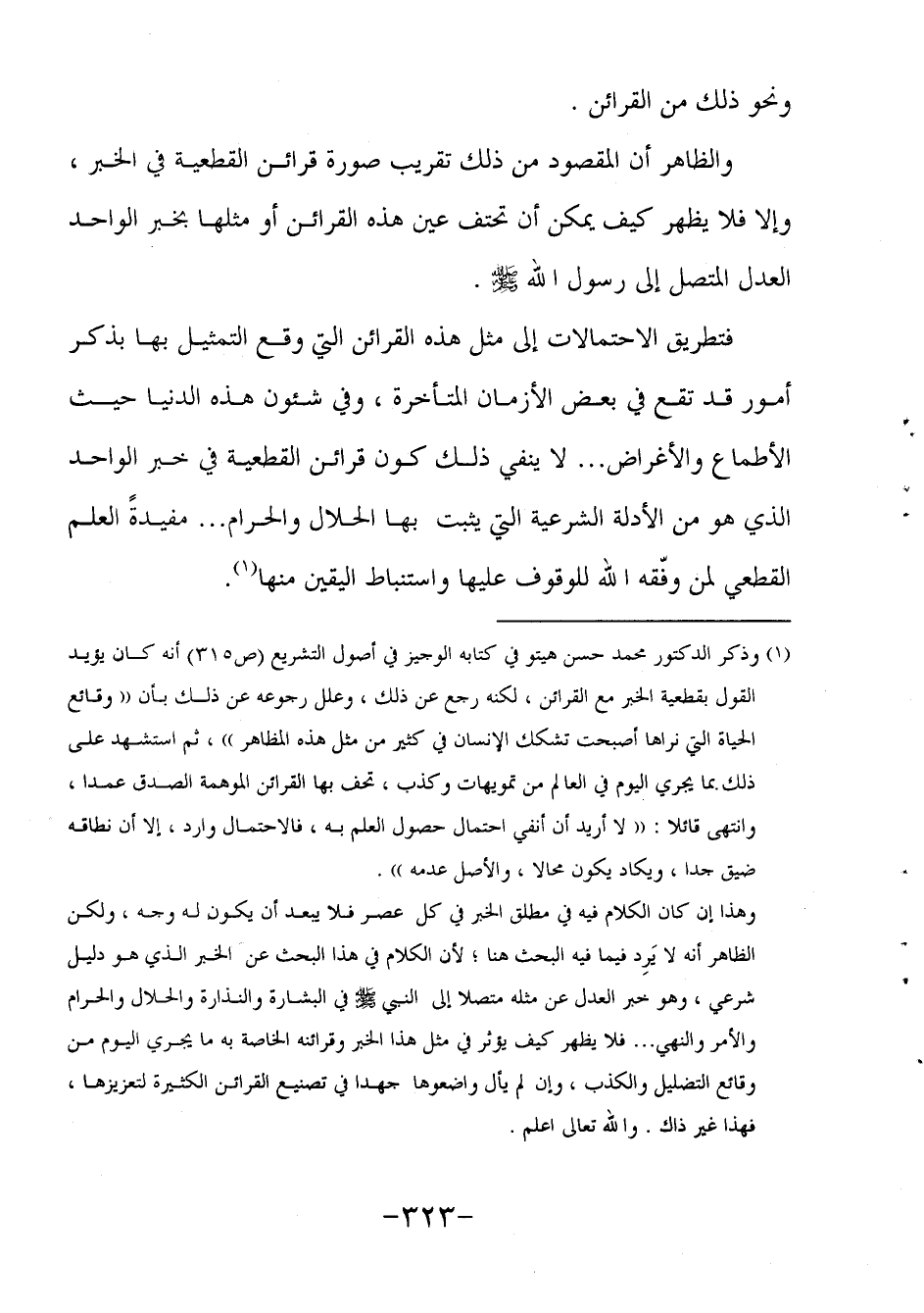 1 وذكر الدكتور محمد حسن هيتو في كتابه الوجيز في أصول التشريع (ص315) أنه كان يؤيد القول بقطعية الخبر مع القرائن لكنه رجع عن ذلك، وعلل رجوعه عن ذلك بأن "وقائع الحياة التي نراها أصبحت تشكك الإنسان في كثير من مثل هذه المظاهر"، ثم استشهد على ذلك بما يجري اليوم في العالم من تمويهات وكذب تحف بها القرائن الموهمة الصدق عمدا، وانتهى قائلا: "لا أريد أن أنفي احتمال حصول العلم به فالاحتمال وارد إلا أن نطاقه ضيق جدا ويكاد يكون محالا والأصل عدمه".