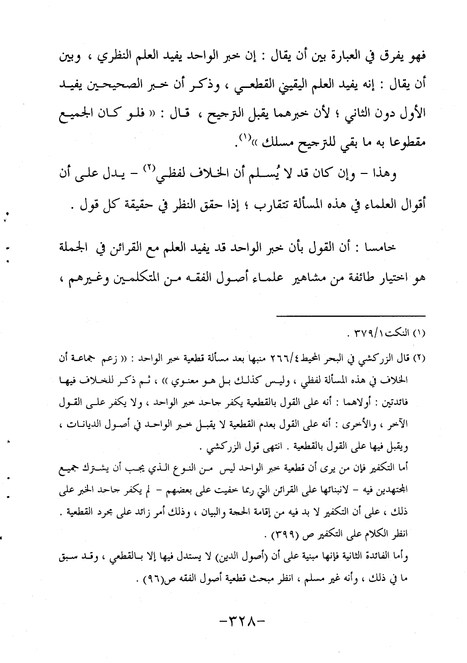 2 قال الزركشي في البحر المحيط4/266 منبها بعد مسألة قطعية خبر الواحد: "زعم جماعة أن الخلاف في هذه المسألة لفظي، وليس كذلك بل هو معنوي"، ثم ذكر للخلاف فيها فائدتين: أولاهما أنه على القول بالقطعية يكفر جاحد خبر الواحد ولا يكفر على القول الآخر، والأخرى أنه على القول بعدم القطعية لا يقبل خبر الواحد في أصول الديانات ويقبل فيها على القول بالقطعية. انتهى قول الزركشي.