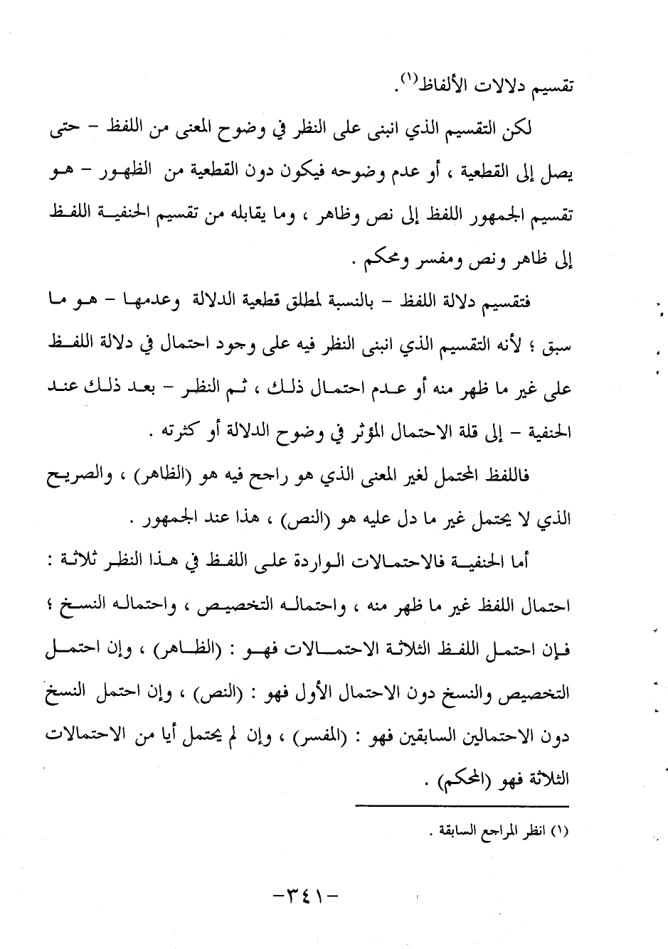لكن التقسيم الذي انبنى على النظر في وضوح المعنى من اللفظ حتى يصل إلى القطعية أو عدم وضوحه فيكون دون القطعية من الظهور - هو تقسيم الجمهور اللفظ إلى نص وظاهر وما يقابله من تقسيم الحنفية اللفظ إلى ظاهر ونص ومفسر ومحكم.