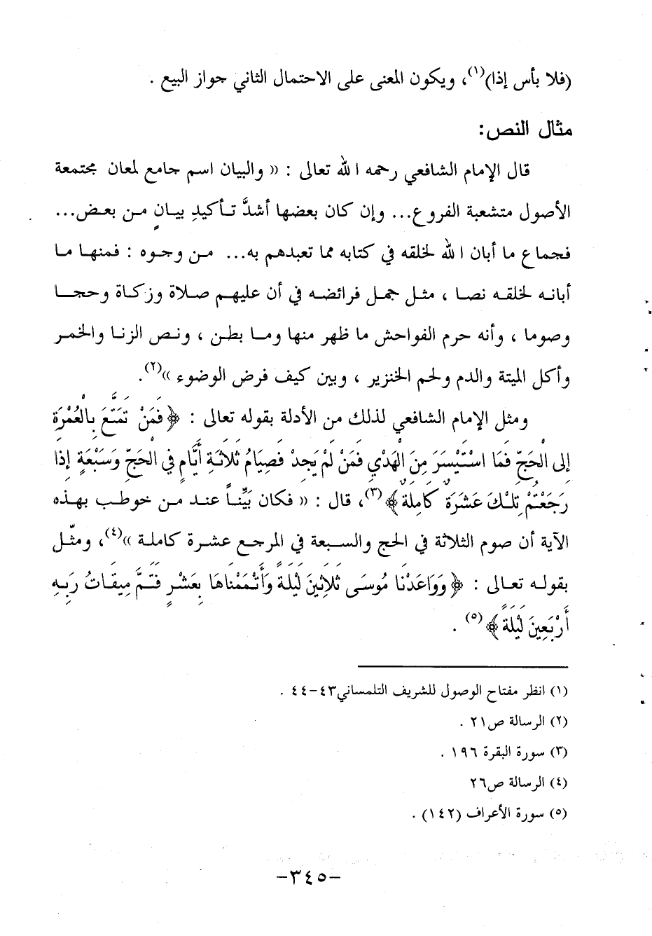 قال الإمام الشافعي رحمه الله تعالى: "والبيان اسم جامع لمعان مجتمعة الأصول متشعبة الفروع ... وإن كان بعضها أشدَّ تأكيدِ بيانٍ من بعض ... فجماع ما أبان الله لخلقه في كتابه مما تعبدهم به ... من وجوه: فمنها ما أبانه لخلقه نصا مثل جمل فرائضه في أن عليهم صلاة وزكاة وحجا وصوما وأنه حرم الفواحش ما ظهر منها وما بطن، ونص الزنا والخمر وأكل الميتة والدم ولحم الخنزير، وبين كيف فرض الوضوء"2.