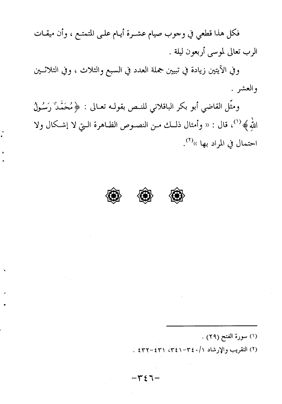 ومثل القاضي أبو بكر الباقلاني للنص بقوله تعالى: {مُحَمَّدٌ رَسُولُ اللهِ} 1 قال: "وأمثال ذلك من النصوص الظاهرة التي لا إشكال ولا احتمال في المراد بها"2.