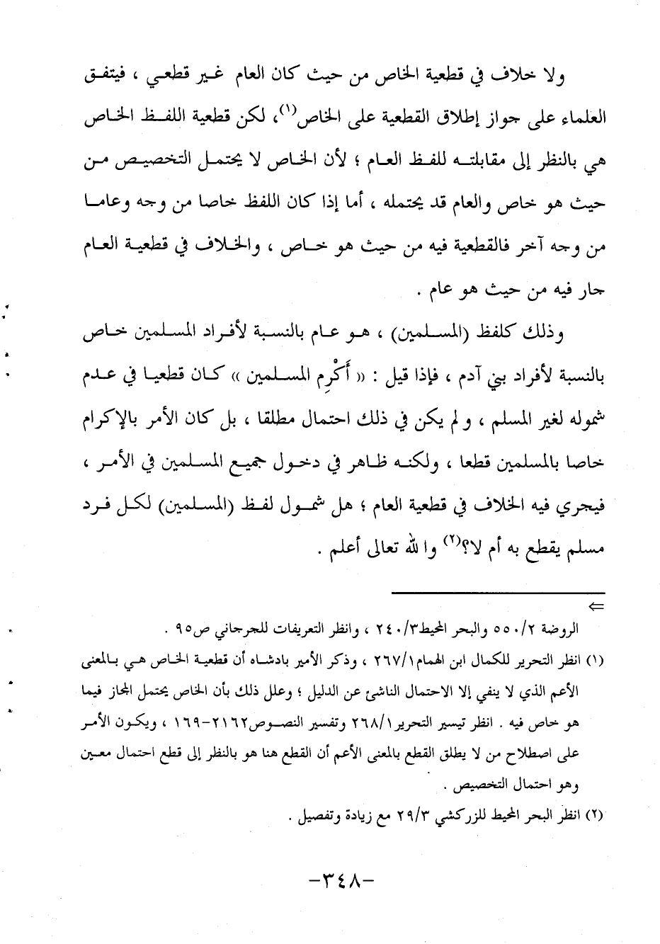 وذلك كلفظ (المسلمين) ، هو عام بالنسبة لأفراد المسلمين خاص بالنسبة لأفراد بني آدم، فإذا قيل: "أَكْرِم المسلمين" كان قطعيا في عدم شموله لغير المسلم ولم يكن في ذلك احتمال مطلقا بل كان الأمر بالإكرام خاصا بالمسلمين قطعا، ولكنه ظاهر في دخول جميع المسلمين في الأمر فيجري فيه الخلاف في قطعية العام، هل شمول لفظ (المسلمين) لكل فرد مسلم يقطع به أم لا؟ 2 والله تعالى أعلم.