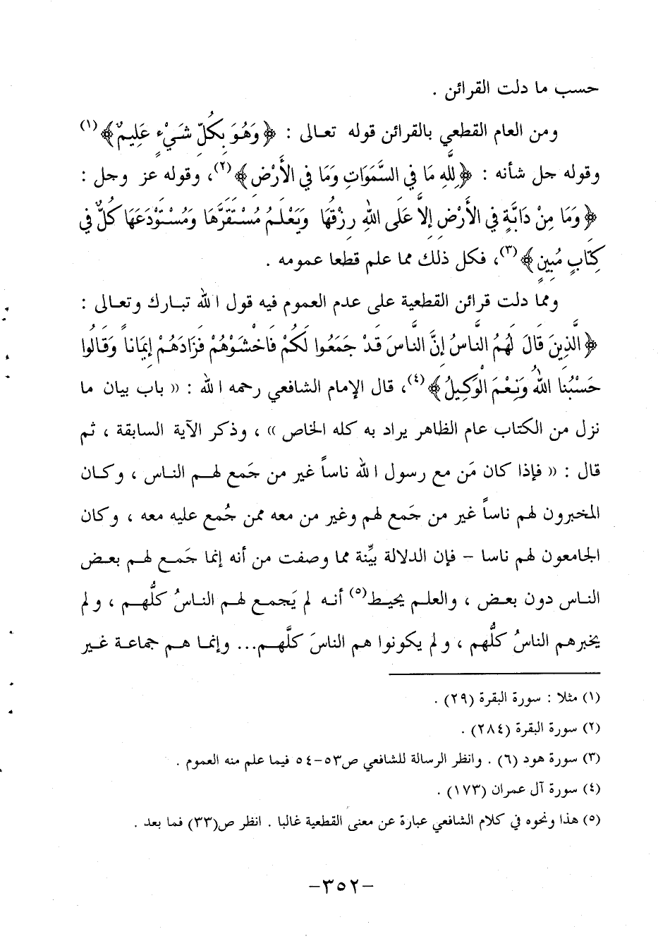 ومما دلت قرائن القطعية على عدم العموم فيه قول الله تبارك وتعالى: {الَّذِينَ قَالَ لَهُمُ النَّاسُ إِنَّ النَّاسَ قَدْ جَمَعُوا لَكُمْ فَاخْشَوْهُمْ فَزَادَهُمْ إِيمَاناً وَقَالُوا حَسْبُنَا اللهُ وَنِعْمَ الْوَكِيلُ} 4، قال الإمام الشافعي رحمه الله: "باب بيان ما نزل من الكتاب عام الظاهر يراد به كله الخاص" وذكر الآية السابقة ثم قال: "فإذا كان مَن مع رسول الله ناساً غير من جَمع لهم الناس وكان المخبرون لهم ناساً غير من جَمع لهم وغير من معه ممن جُمع عليه معه وكان الجامعون لهم ناسا - فإن الدلالة بيِّنة مما وصفت من أنه إنما جَمع لهم بعض الناس دون بعض، والعلم يحيط5 أنه لم يَجمع لهم الناسُ كلُّهم ولم يخبرهم الناسُ كلُّهم ولم يكونوا هم الناسَ كلَّهم ... وإنما هم جماعة غير