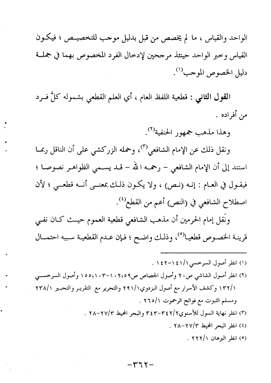 ونَقل إمام الحرمين أن مذهب الشافعي قطعية العموم حيث كان نفي قرينة الخصوص قطعيا5، وذلك واضح، فإن عدم القطعية سببه احتمال