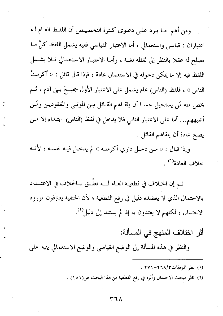 ومن أهم ما يرد على دعوى كثرة التخصيص أن اللفظ العام له اعتباران: قياسي واستعمالي، أما الاعتبار القياسي ففيه يشمل اللفظ كلَّ ما يصلح له عقلا بالنظر إلى لفظه لغة، وأما الاعتبار الاستعمالي فلا يشمل اللفظ فيه إلا ما يمكن دخوله في الاستعمال عادة، فإذا قال قائل: "أكرمتُ الناس"، فلفظ (الناس) عام يشمل على الاعتبار الأول جميعَ بني آدم ثم يخص منه من يستحيل حسا أن يلقاهم القائل ومن أشبههم من الموتى والمفقودين ... أما على الاعتبار الثاني فلا يدخل في لفظ (الناس) ابتداء إلا من يصح عادة أن يلقاهم القائل.