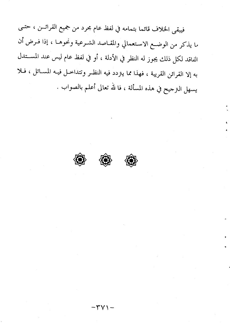 فيبقى الخلاف على حاله في لفظ عام مجرد من جميع القرائن حتى ما يذكر من الوضع الاستعمالي والمقاصد الشرعية ونحوها، إذا فرض أن الفاقد لكل ذلك يجوز له النظر في الأدلة، أو في لفظ عام ليس عند المستدل به إلا القرائن القريبة، فهذا مما يتردد فيه النظر وتتداخل فيه المسائل، فلا يسهل الترجيح في هذه المسألة، فالله تعالى أعلم بالصواب.