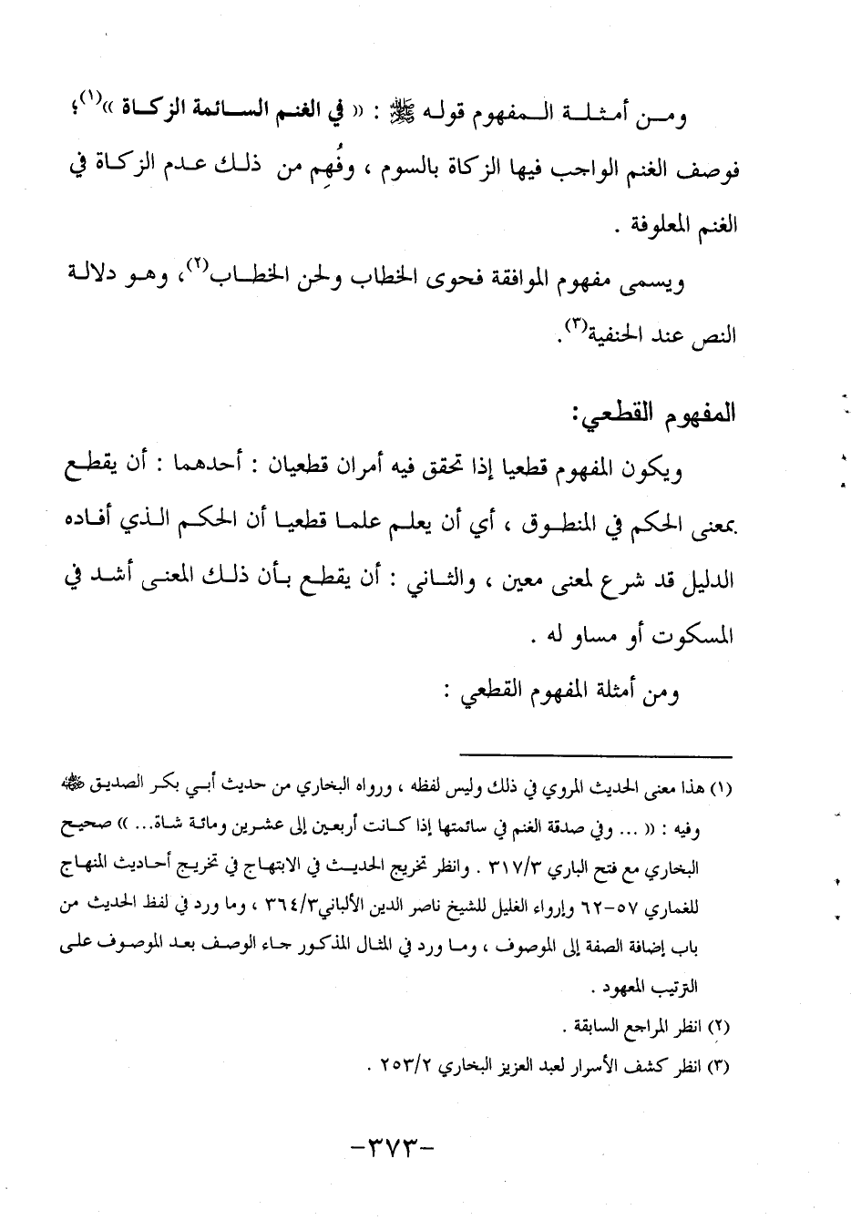 ومن أمثلة المفهوم قوله صلى الله عليه وسلم: "في الغنم السائمة الزكاة"1 فلما وصف الغنم الواجب فيها الزكاة بالسوم فُهم من ذلك عدم الزكاة في الغنم المعلوفة.