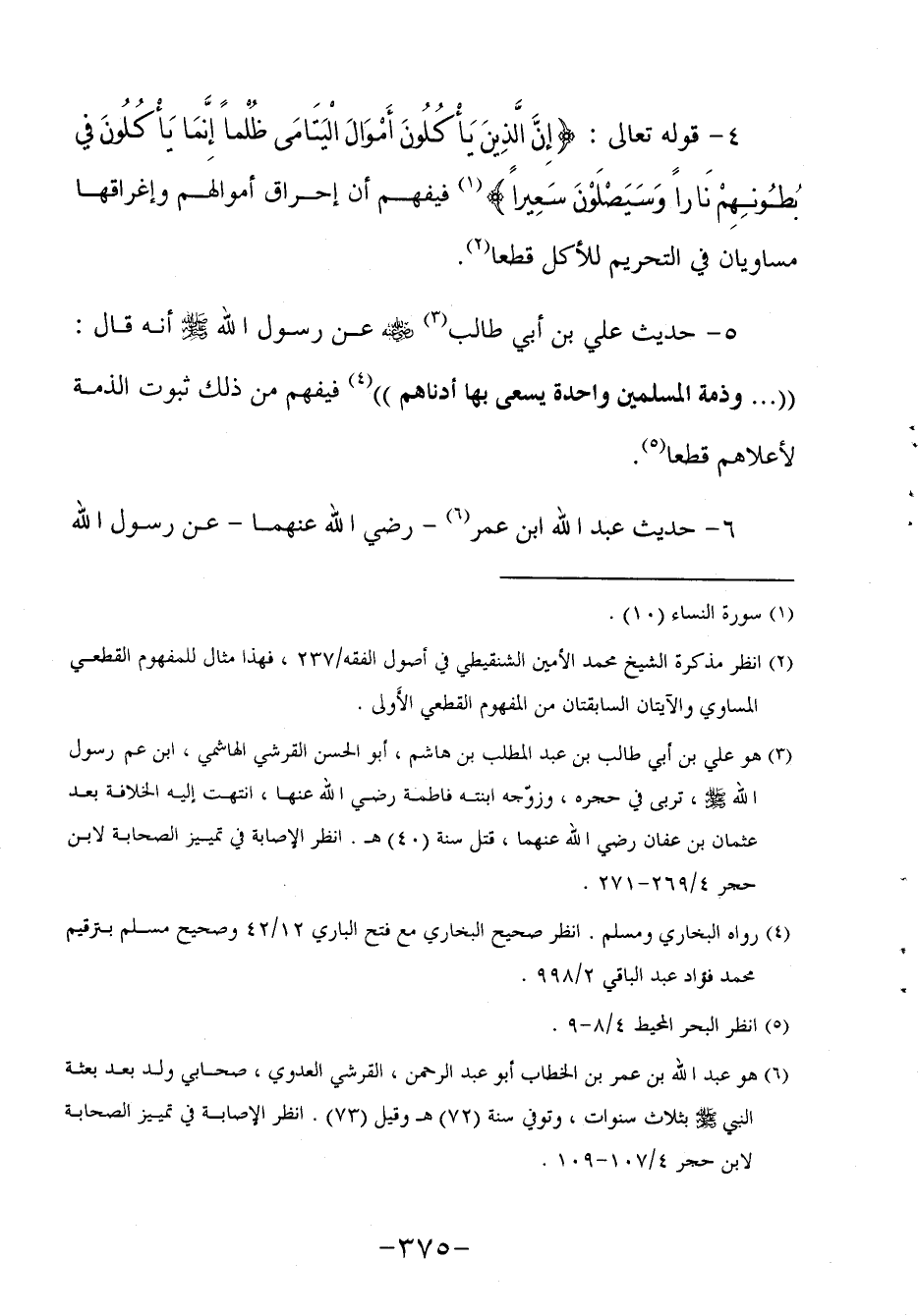 4- قوله تعالى: {إِنَّ الَّذِينَ يَأْ كُلُونَ أَمْوَالَ الْيَتَامَى ظُلْماً إِنَّمَا يَأْ كُلُونَ في بُطُونِهِمْ نَاراً وَسَيَصْلَوْنَ سَعِيراً} 1 فيفهم أن إحراق أموالهم وإغراقها مساويان في التحريم للأكل قطعا2.