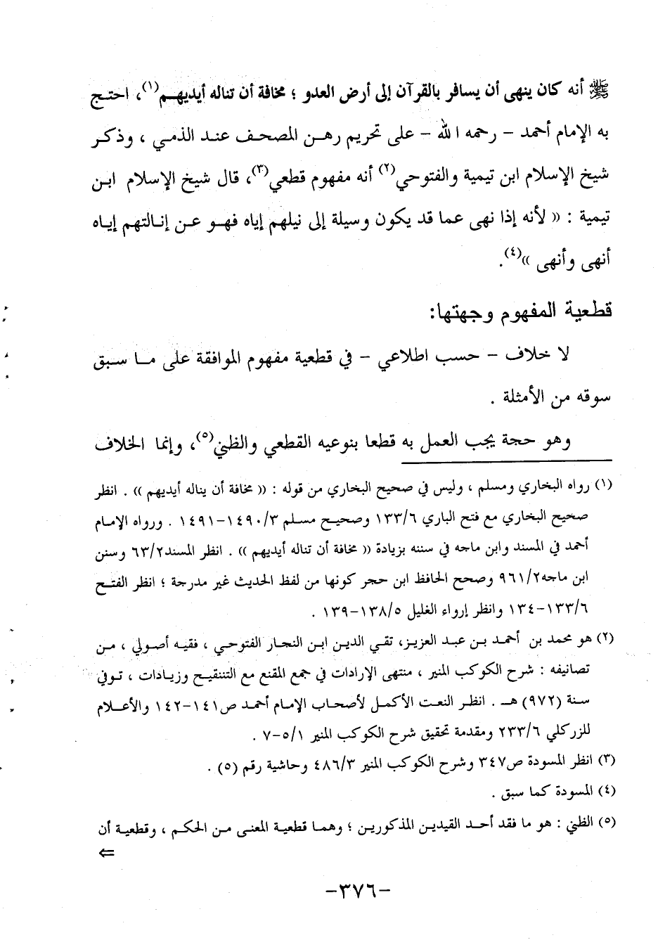 صلى الله عليه وسلم أنه كان ينهى أن يسافر بالقرآن إلى أرض العدو، مخافة أن تناله أيديهم1، احتج به الإمام أحمد - رحمه الله - على تحريم رهن المصحف عند الذمي، وذكر شيخ الإسلام ابن تيمية والفتوحي2 أنه مفهوم قطعي3، قال شيخ الإسلام ابن تيمية: "لأنه إذا نهى عما قد يكون وسيلة إلى نيلهم إياه فهو عن إنالتهم إياه أنهى وأنهى"4.