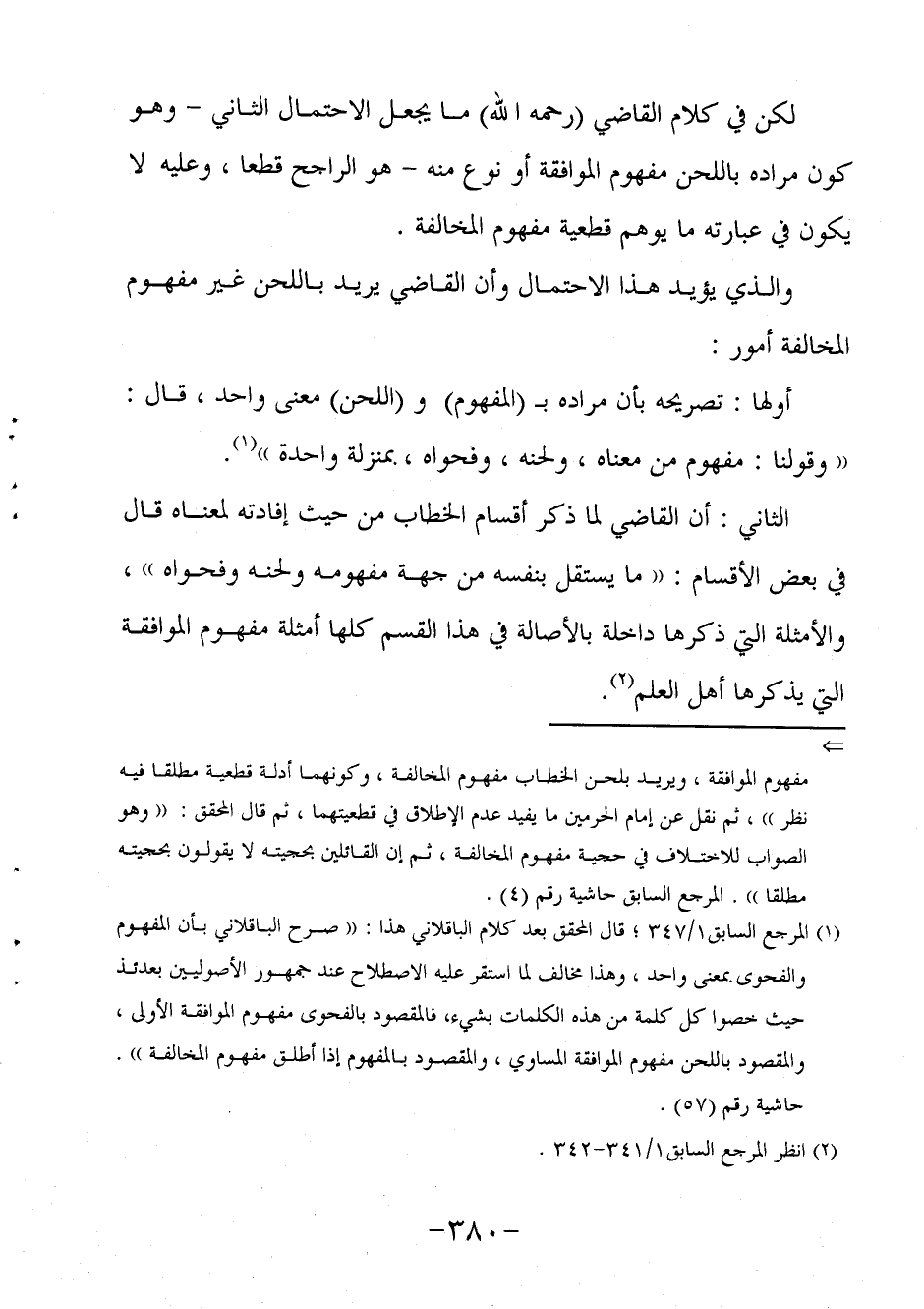 لكن في كلام القاضي - رحمه الله - ما يجعل الاحتمال الثاني - وهو كون مراده باللحن مفهوم الموافقة أو نوع منه - هو الراجح قطعا، وعليه لا يكون في عبارته ما يوهم قطعية مفهوم المخالفة.