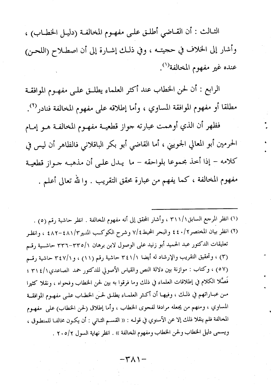 2 انظر بيان المختصر2/440 والبحر المحيط4/7 وشرح الكوكب المنير3/481-482، وانظر تعليقات الدكتور عبد الحميد أبو زنيد على الوصول لابن برهان 1/335-336 حاشية رقم (3) ، وتحقيق التقريب والإرشاد له أيضا 1/341 حاشية رقم (11) ، و1/347 حاشية رقم (57) ، وكتاب: موازنة بين دلالة النص والقياس الأصولي للدكتور حمد الصاعدي1/314، فَصَّلا الكلام في إطلاقات العلماء في ذلك وما فرقوا به بين لحن الخطاب وفحواه، ونقلا كثيرا من عباراتهم في ذلك، وفيها أن أكثر العلماء يطلق لحن الخطاب على مفهوم الموافقة المساوي ومنهم من يجعله مرادفا لفحوى الخطاب، وأما إطلاق (لحن الخطاب) على مفهوم المخالفة فلم ينقلا ذلك إلا عن الآسنوي في قوله: "القسم الثاني: أن يكون مخالفا للمنطوق، ويسمى دليل الخطاب ولحن الخطاب ومفهوم المخالفة". انظر نهاية السول2/205.