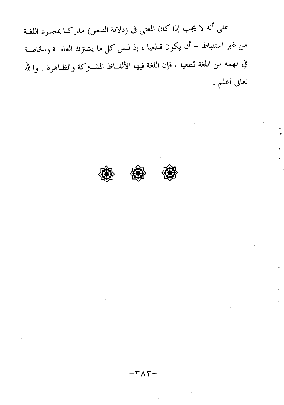 على أنه لا يجب إذا كان المعنى في (دلالة النص) مدركا بمجرد اللغة من غير استنباط - أن يكون قطعيا، إذ ليس كل ما يشترك العامة والخاصة في فهمه من اللغة قطعيا، فإن اللغة فيها الألفاظ المشتركة والظاهرة. والله تعالى أعلم.