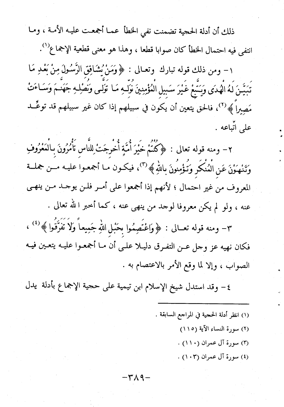 3- ومنه قوله تعالى: {وَاعْتَصِمُوا بِحَبْلِ اللهِ جَمِيعاً وَلاَ تَفَرَّقُوا} 4، فكان نهيه عز وجل عن التفرق دليلا على أن ما أجمعوا عليه يتعين فيه الصواب وإلا لما وقع الأمر بالاعتصام به.