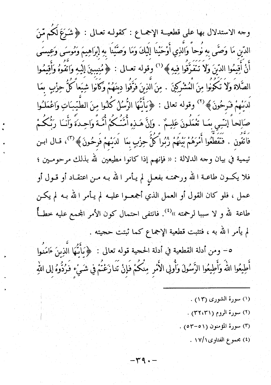 وجه الاستدلال بها على قطعية الإجماع: كقوله تعالى: {شَرَعَ لَكُم مِّنَ الدِّينِ مَا وَصَّى بِهِ نُوحاً وَالَّذِي أَوْحَيْنَا إِلَيْكَ وَمَا وَصَّيْنَا بِهِ إِبْرَاهِيمَ وَمُوسَى وَعِيسَى أَنْ أَقِيمُوا الدِّينَ وَلاَ تَتَفَرَّقُوا فِيهِ} 1 وقوله تعالى: {مُنِيبِينَ إِلَيْهِ وَاتَّقُوهُ وَأَقِيمُوا الصَّلاةَ وَلاَ تَكُونُوا مِنَ الْمُشْرِكِينَ. مِنَ الَّذِينَ فَرَّقُوا دِينَهُمْ وَكَانَوا شِيَعاً كُلُّ حِزْبٍ بِمَا لَدَيهِمْ فَرِحُونَ} 2 وقوله تعالى: {يَأَيهَا الرُّسُلُ كُلُوا مِنَ الطَّيِّباتِ وَاعْمَلُوا صَالِحاً إنِّي بِمَا تَعْمَلُونَ عَلِيمٌ. وَإِنَّ هَذِهِ أُمَّتُكُمْ أُمَّةً وَاحِدَةً وَأَنَا رَبكُمْ فَاتَّقُونِ. فَتَقَطَّعُوا أَمْرَهُمْ بَيْنَهُمْ زُبُراً كُلُّ حِزْبٍ بِمَا لَدَيْهِمْ فَرِحُونَ} 3، قال ابن تيمية في بيان وجه الدلالة: "فإنهم إذا كانوا مطيعين لله بذلك مرحومين فلا يكون طاعة الله ورحمته بفعل لم يأمر الله به من اعتقاد أو قول أو عمل، فلو كان القول أو العمل الذي أجمعوا عليه لم يأمر الله به لم يكن طاعة لله ولا سببا لرحمته"4 اهـ فانتفى احتمال كون الأمر المجمع عليه خطأً لم يأمر الله به، فتثبت قطعية الإجماع كما ثبتت حجيته.