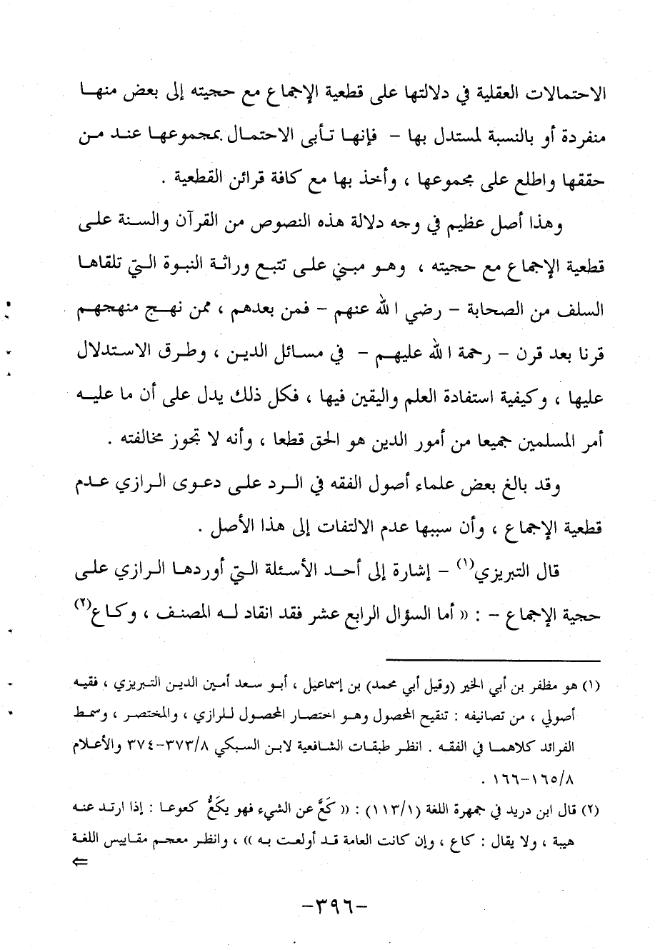 قال التبريزي1 إشارة إلى أحد الأسئلة التي أوردها الرازي على حجية الإجماع: "أما السؤال الرابع عشر فقد انقاد له المصنف وكاع2