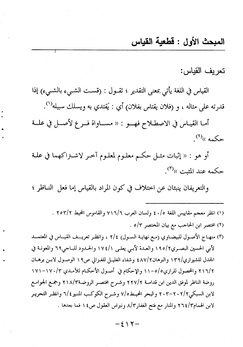 3 منهاج الأصول للبيضاوي (مع نهاية السول) 4/2، وانظر تعريف القياس في المعتمد لأبي الحسين البصري2/195 والعدة لأبي يعلى 1/174 والحدود للباجي69 والمعونة في الجدل للشيرازي/139 والبرهان2/487 وشفاء الغليل للغزالي ص19 الوصول لابن برهان 2/216 والمحصول للرازي5/5-11 والإحكام في أصول الأحكام للآمدي 3/170-171 روضة الناظر لموفق الدين ابن قدامة 2/227 وشرح مختصر الروضة3/218 وجمع الجوامع لابن السبكي2/202-203 والبحر المحيط5/7 وشرح الكوكب المنير4/6 وانظر التحرير لابن الهمام3/264 والمنار مع فتح الغفار3/8 ونبراس العقول ص14 فما بعدها.