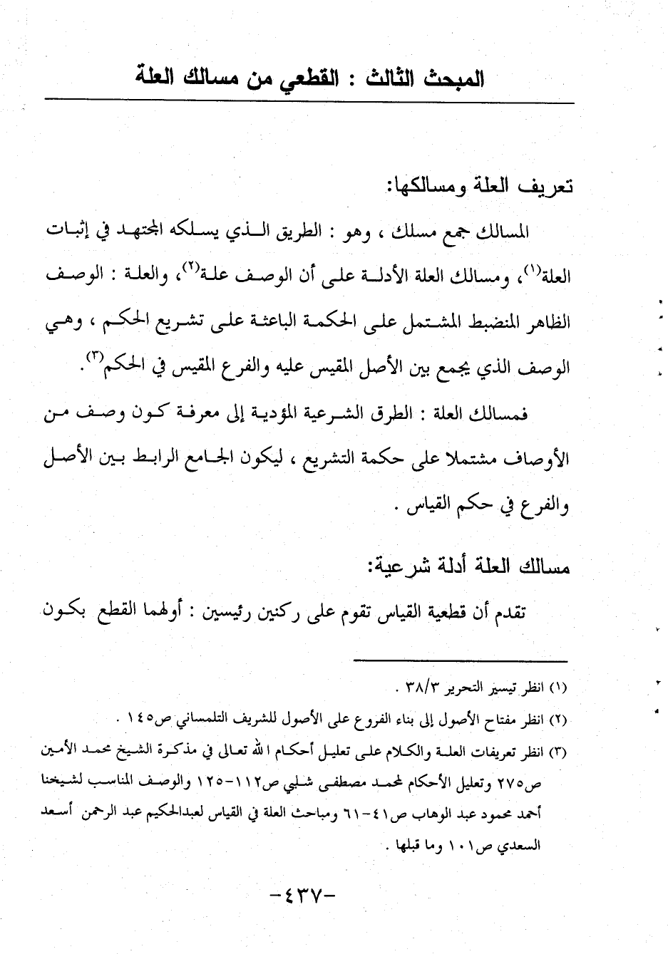 3 انظر تعريفات العلة والكلام على تعليل أحكام الله تعالى في مذكرة الشيخ محمد الأمين ص275 وتعليل الأحكام لمحمد مصطفى شلبي ص112-125 والوصف المناسب لشيخنا أحمد محمود عبد الوهاب ص41-61 ومباحث العلة في القياس لعبد الحكيم عبد الرحمن أسعد السعدي ص101 وما قبلها.