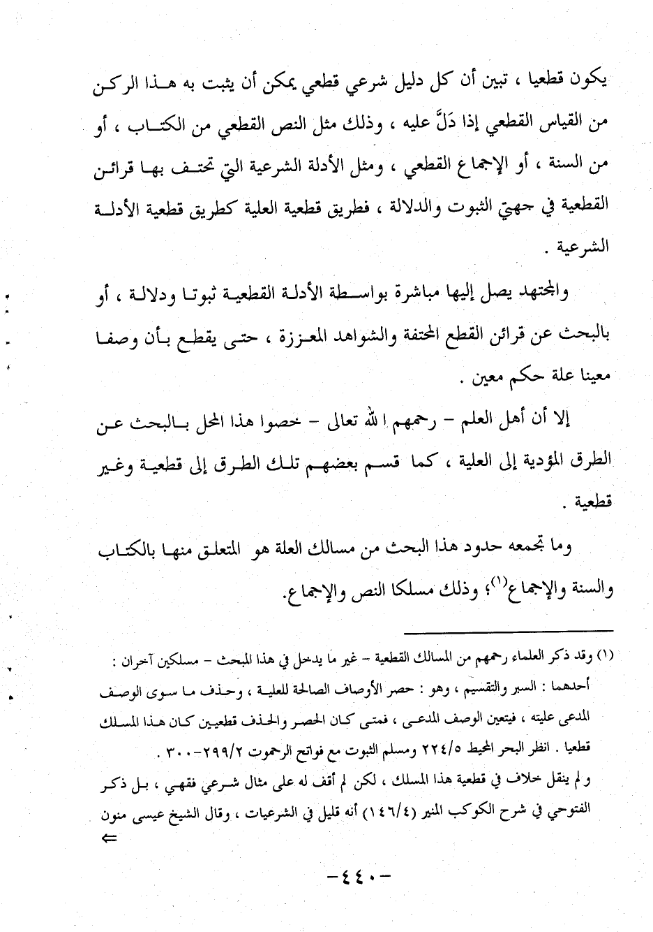 أحدهما: السبر والتقسيم وهو حصر الأوصاف الصالحة للعلية وحذف ما سوى الوصف المدعى عليته فيتعين الوصف المدعى، فمتى كان الحصر والحذف قطعيين كان هذا المسلك قطعيا. انظر البحر المحيط 5/224 ومسلم الثبوت مع فواتح الرحموت 2/299-300.