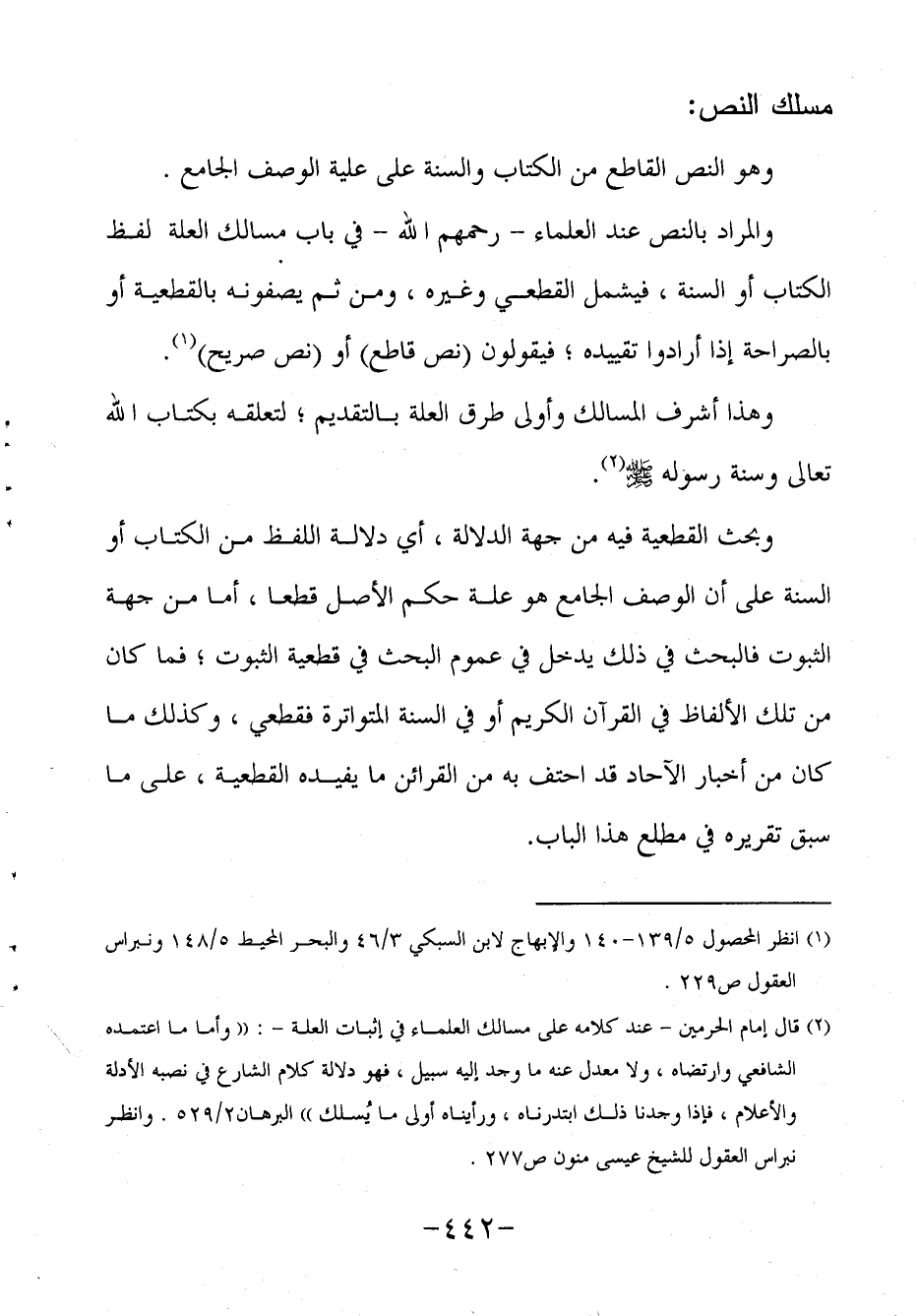 والمراد بالنص عند العلماء - رحمهم الله - في باب مسالك العلة لفظ الكتاب أو السنة، فيشمل القطعي وغيره، ومن ثم يصفونه بالقطعية أو بالصراحة إذا أرادوا تقييده فيقولون (نص قاطع) أو (نص صريح) 1.