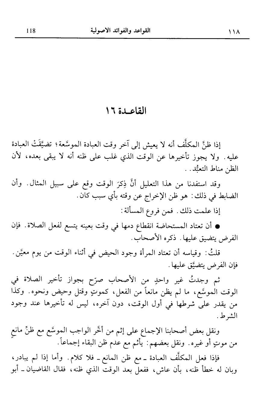 القاعدة 16: إذا ظن المكلف أنه لا يعيش إلى آخر وقت العبادة الموسعة تضيقت العبادة عليه ولا يجوز تأخيرها عن الوقت الذي غلب على ظنه أنه لا يبقى بعده لأن الظن مناط التعبد.