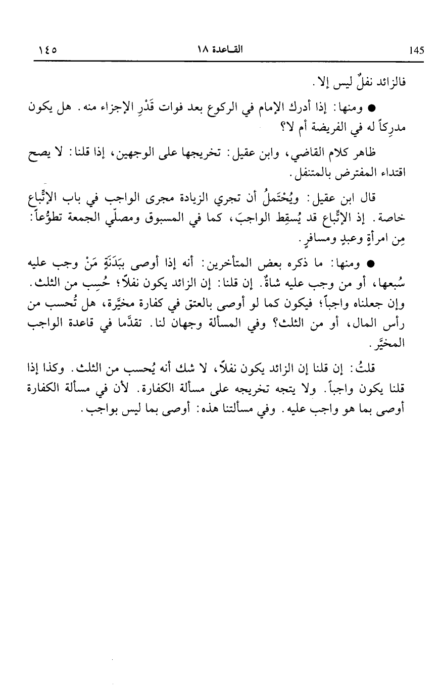 قال ابن عقيل ويحتمل أن تجرى الزيادة مجرى الواجب في باب الاتباع خاصة إذ الاتباع قد يسقط الواجب كما في المسبوق ومصلى الجمعة تطوعا من امرأة وعبد ومسافر.