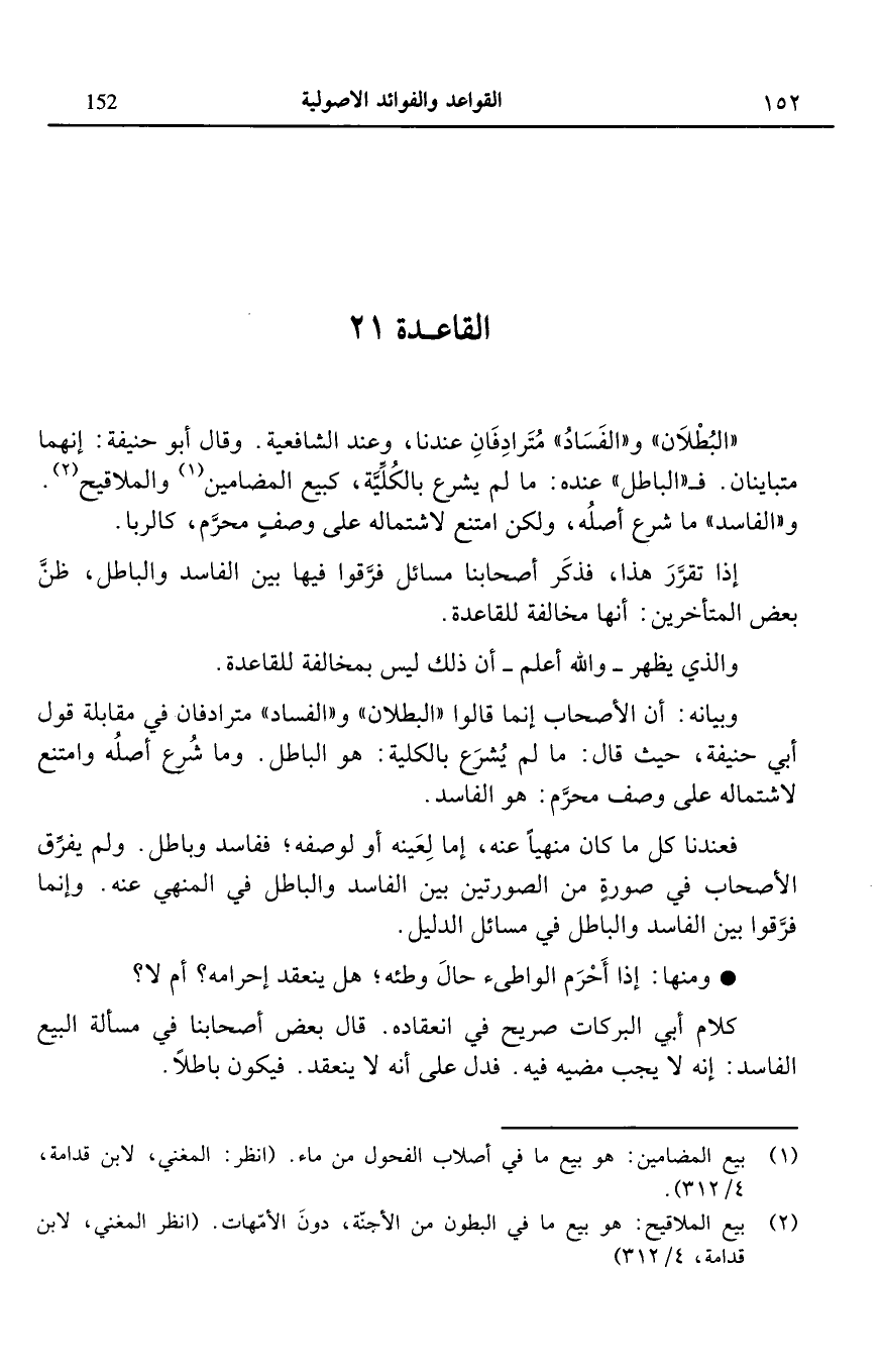 القاعدة 21: البطلان والفساد مترادفان عندنا وعند الشافعية وقال أبو حنيفة إنهما متباينان فـ الباطل عنده ما لم يشرع بالكلية كبيع المضامين1 والملاقيح2 والفاسد ما شرع أصله ولكن امتنع لاشتماله على وصف محرم كالربا.
