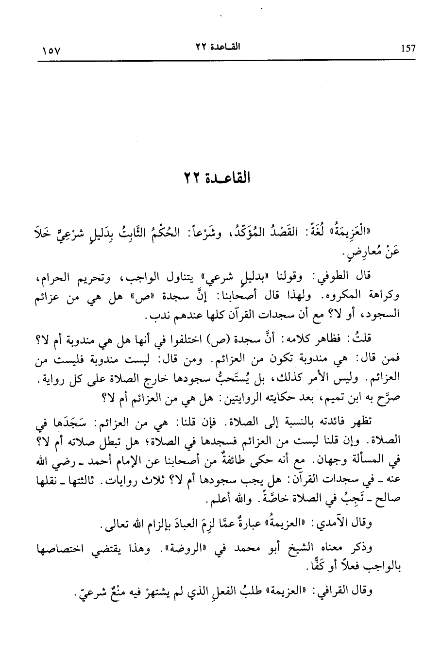 القاعدة 22: العزيمة لغة القصد المؤكد وشرعا الحكم الثابت بدليل شرعى خلا عن معارض.