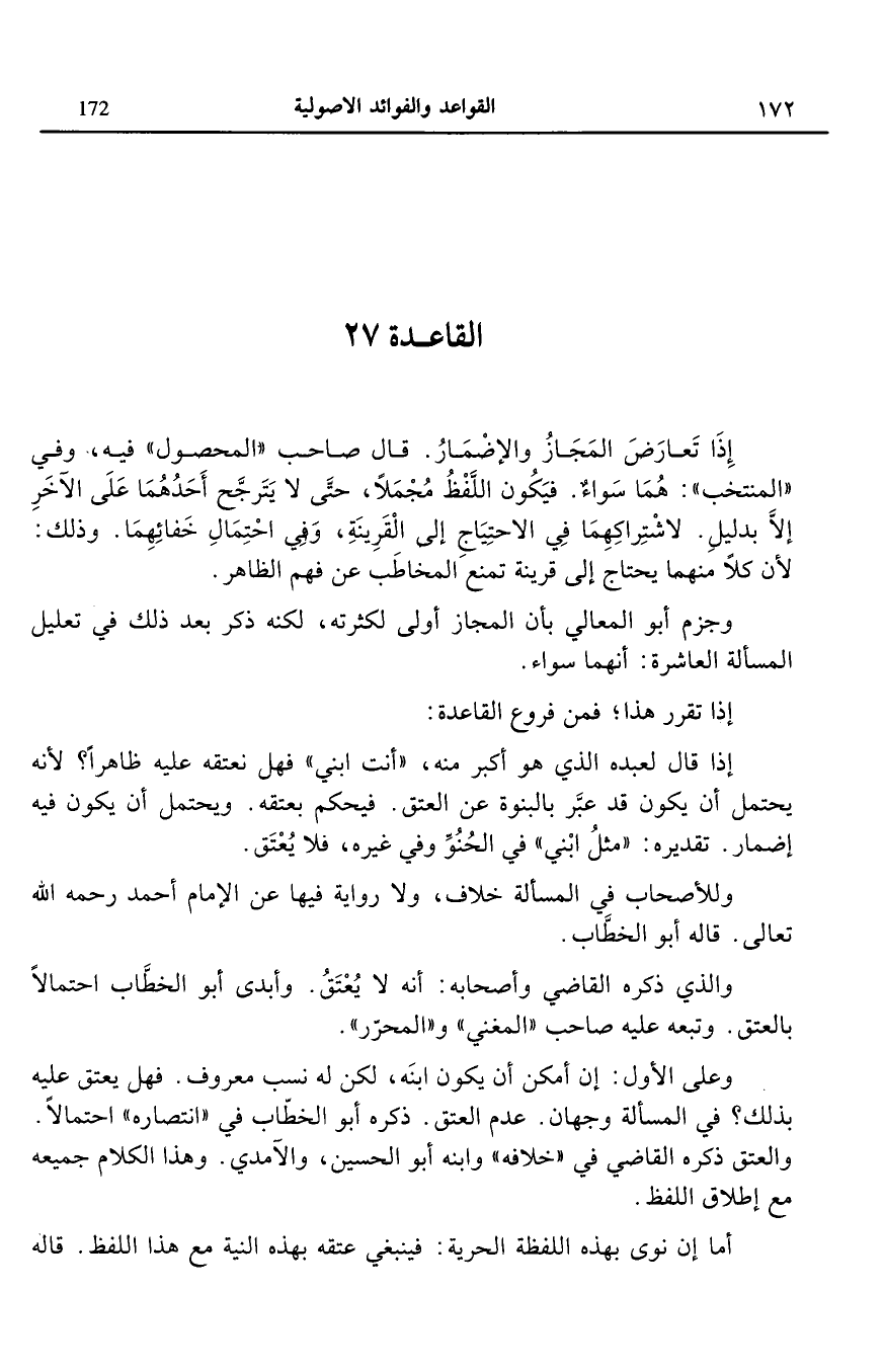 القاعدة 27: إذا تعارض المجاز والإضمار قال صاحب المحصول فيه وفي المنتخب هما سواء فيكون اللفظ مجملا حتى لا يترجح أحدهما على الآخر إلا بدليل لاشتراكهما في الاحتياج إلى القرينة وفي احتمال خفائهما وذلك لأن كلا منهما يحتاج إلى قرينة تمنع المخاطب عن فهم الظاهر.