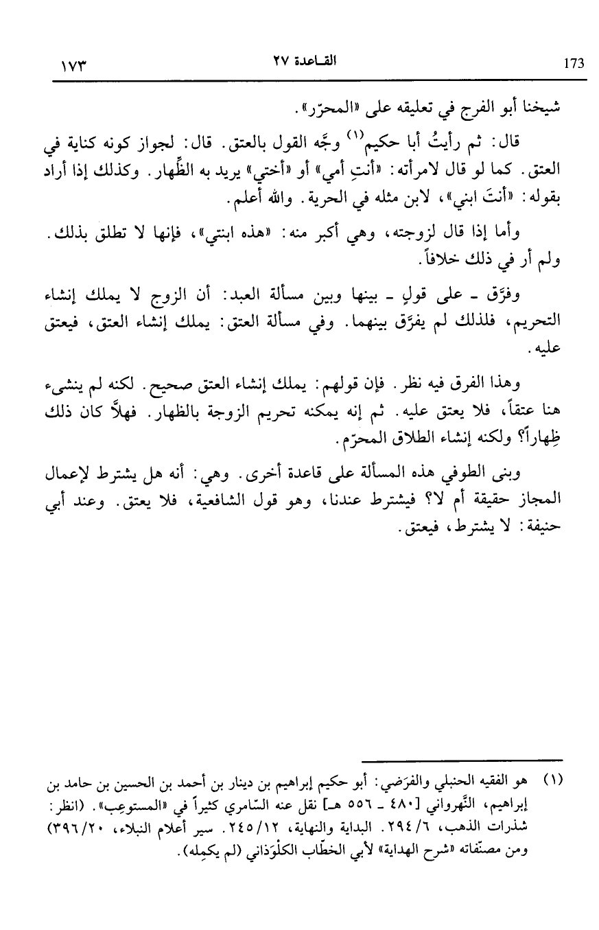 وبنى الطوفي هذه المسألة على قاعدة أخرى وهى أنه هل يشترط لأعمال المجاز حقيقة أم لا فيشترط عندنا وهو قول الشافعية فلا يعتق وعند أبى حنيفة لا يشترط فيعتق.