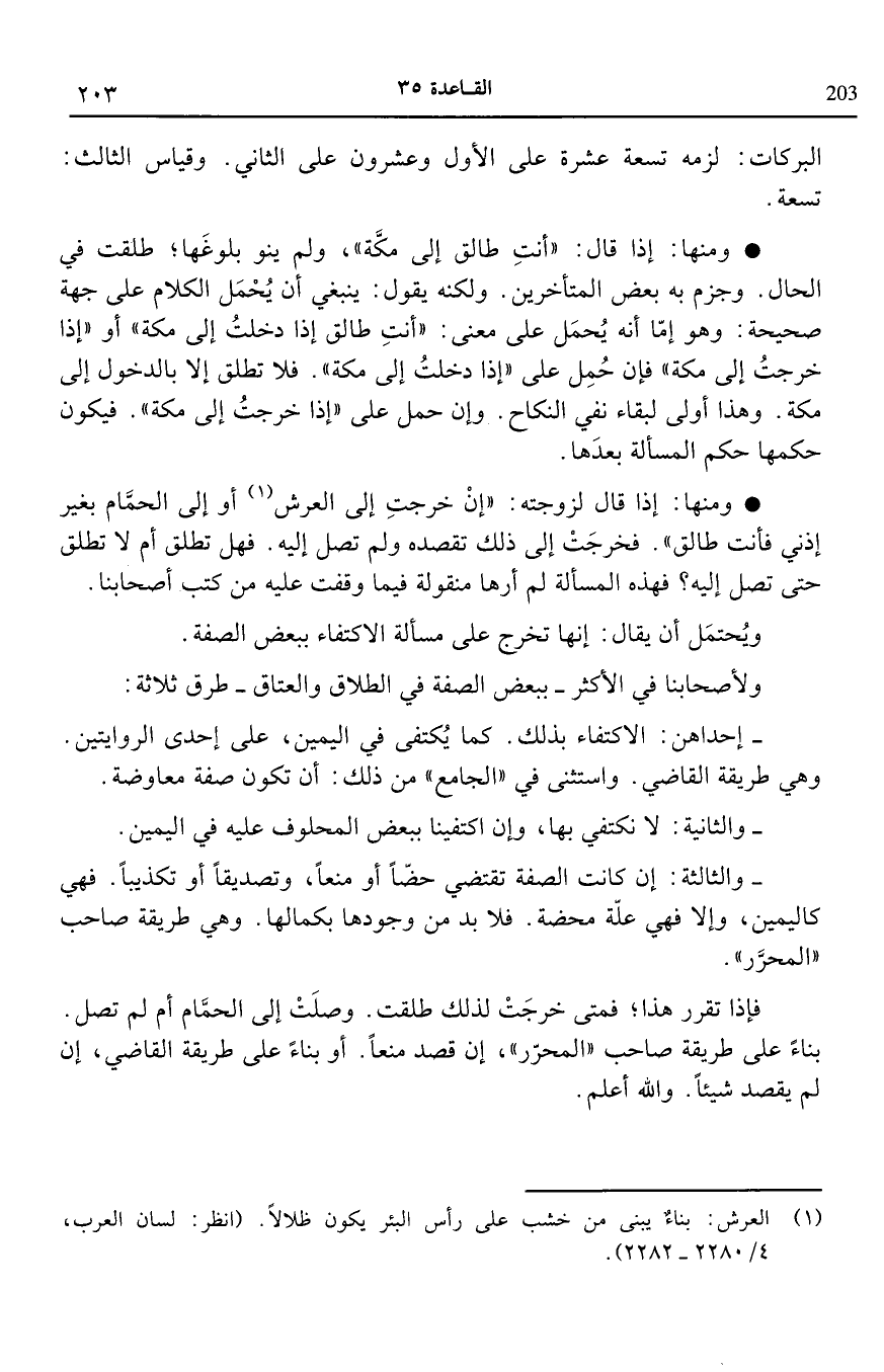 ومنها: إذا قال لزوجته إن خرجت إلى العرش1 أو إلى الحمام بغير إذنى فأنت طالق فخرجت إلى ذلك تقصده ولم تصل إليه فهل تطلق أم لا تطلق حتى إليه فهذه المسألة لم أرها منقولة فيما وقفت عليه من كتب أصحابنا.
