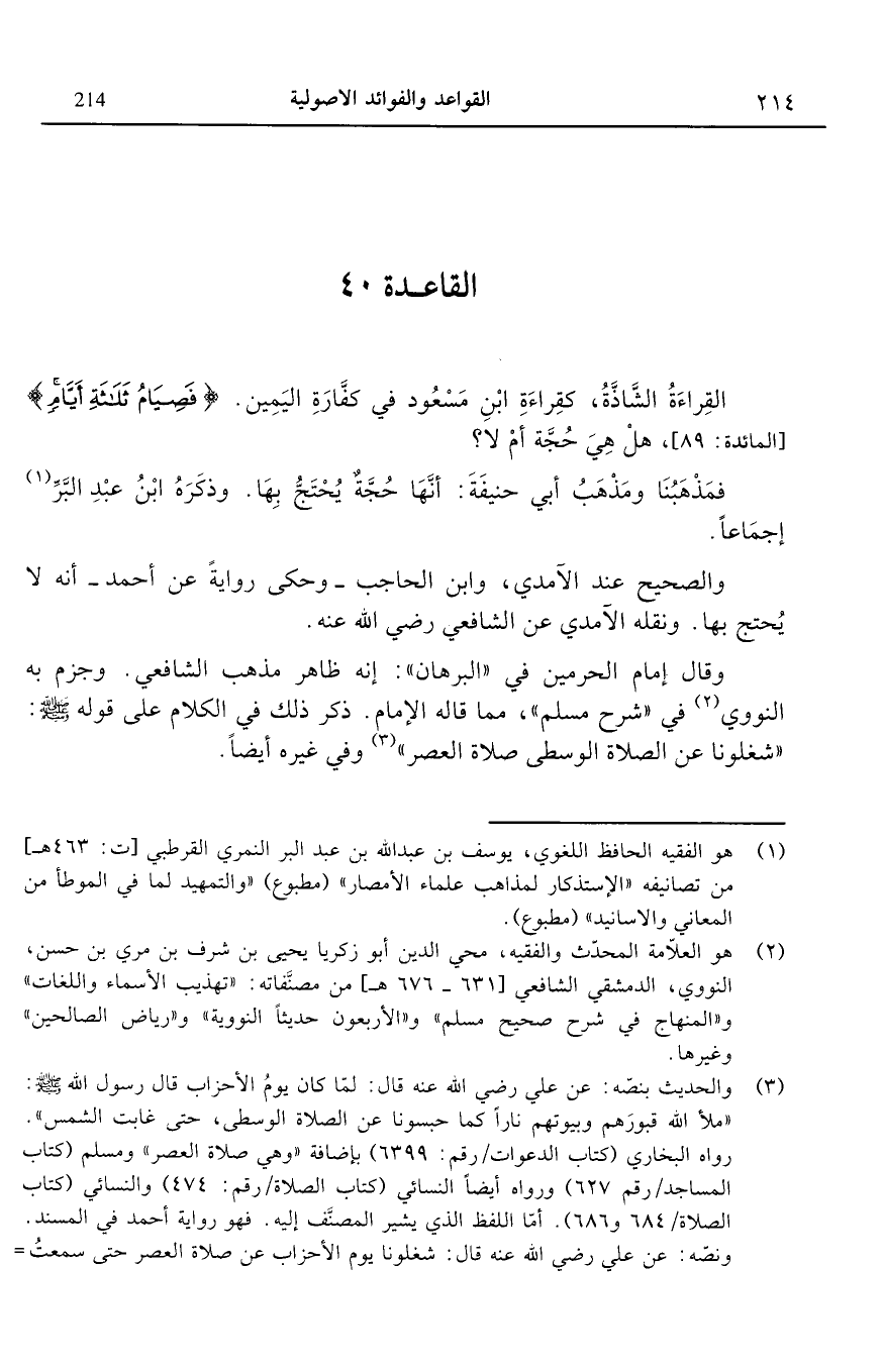 القاعدة 40: القراءة الشاذة كقراءة ابن مسعود في كفارة اليمين {فصيام ثلاثة أيام متتابعات} هل هى حجة أم لا؟