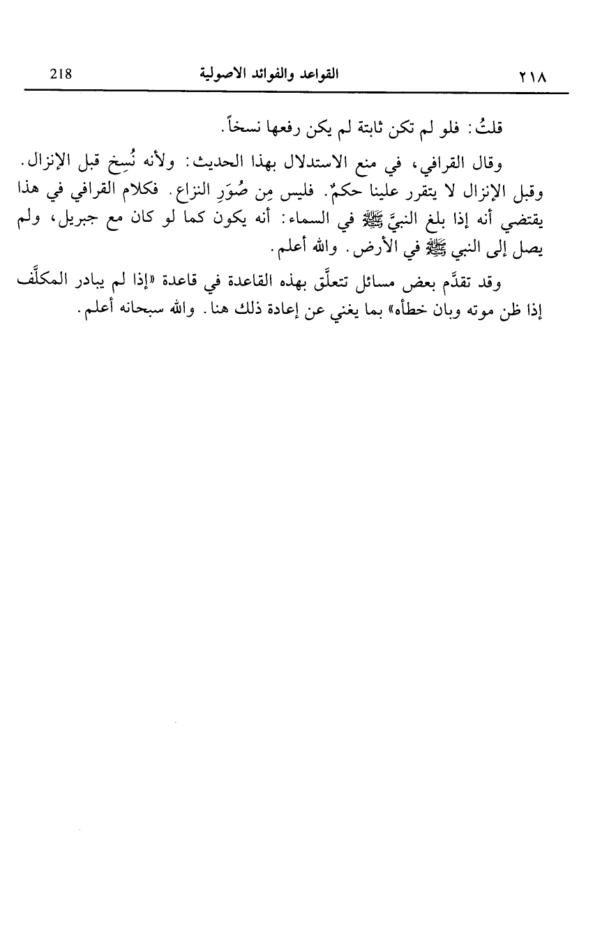 وقال القرافي في منع الاستدلال بهذا الحديث ولأنه نسخ قبل الإنزال وقبل الإنزال لا يتقرر علينا حكم فليس من صور النزاع فكلام القرافي في هذا يقتضى أنه إذا بلغ النبى صلى الله عليه وسلم في السماء أنه يكون كما لو كان مع جبريل ولم يصل إلى النبى صلى الله عليه وسلم في الأرض والله أعلم.